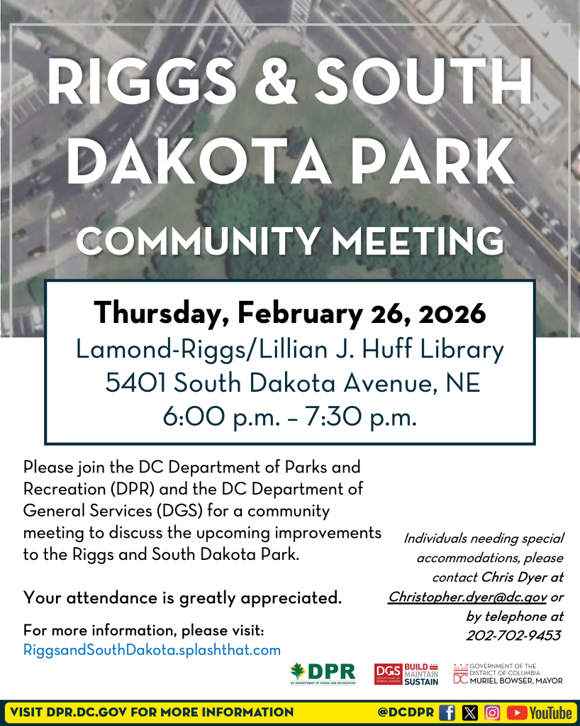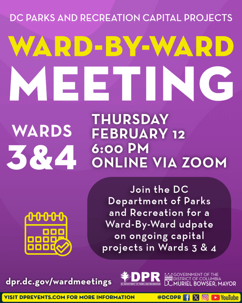 DPR and DGS will hold a Ward 5 parks capital projects meeting on February 5 at 6pm via zoom.