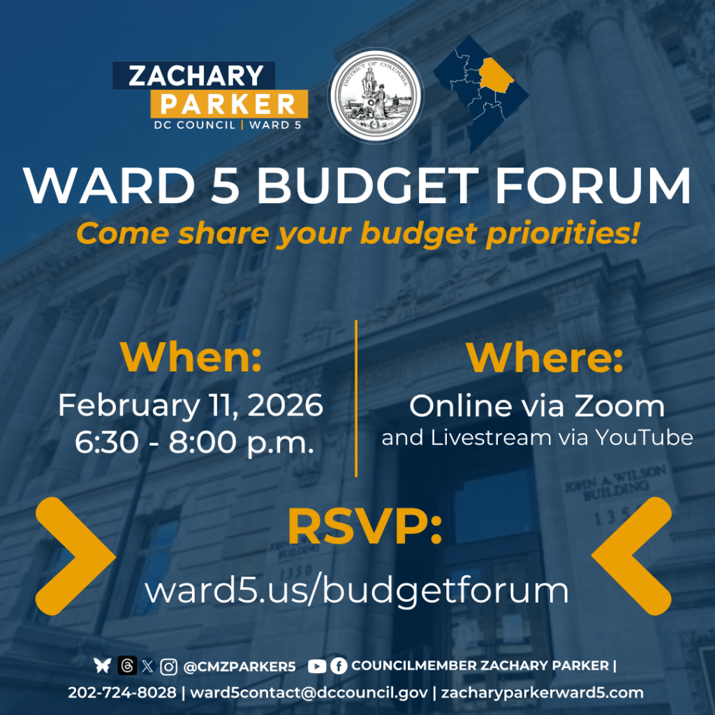 Testify about District agencies’ performance at performance oversight hearings. Flag agency performance issues with Councilmember Parker’s office at ward5.us/oversight.