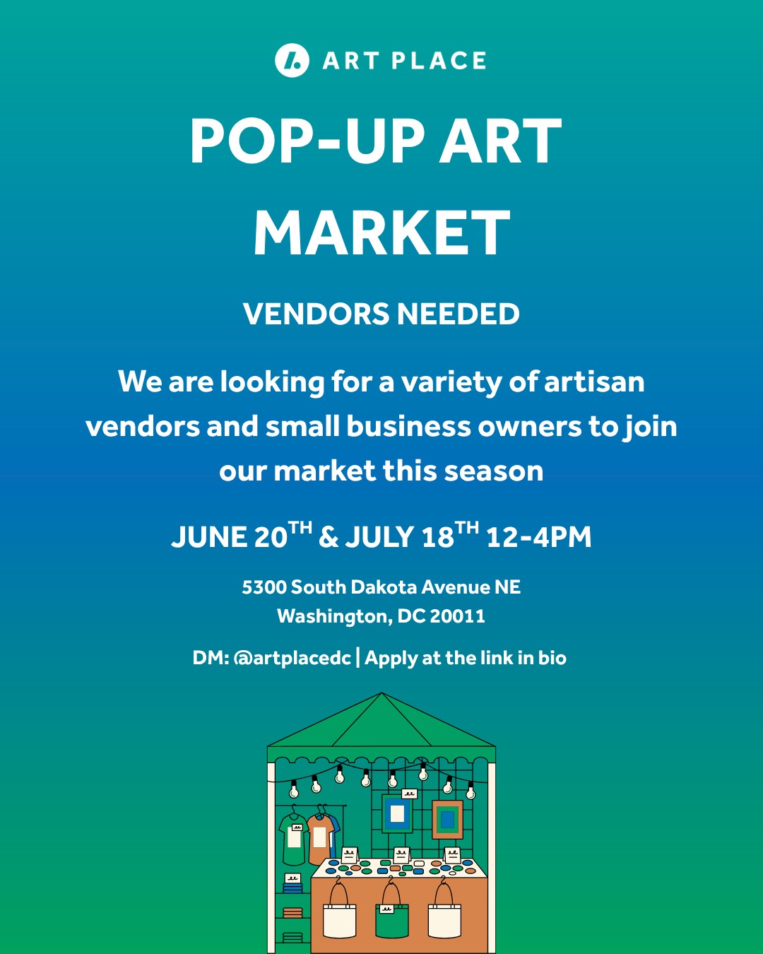 Art Place at Fort Totten is holding a Pop-Up Art Market on June 20, 2026, and July 18, 2026. They are seeking vendors in the following categories: jewelry, crafts, candles, painting, artwork, body and skincare, baked goods and more.
