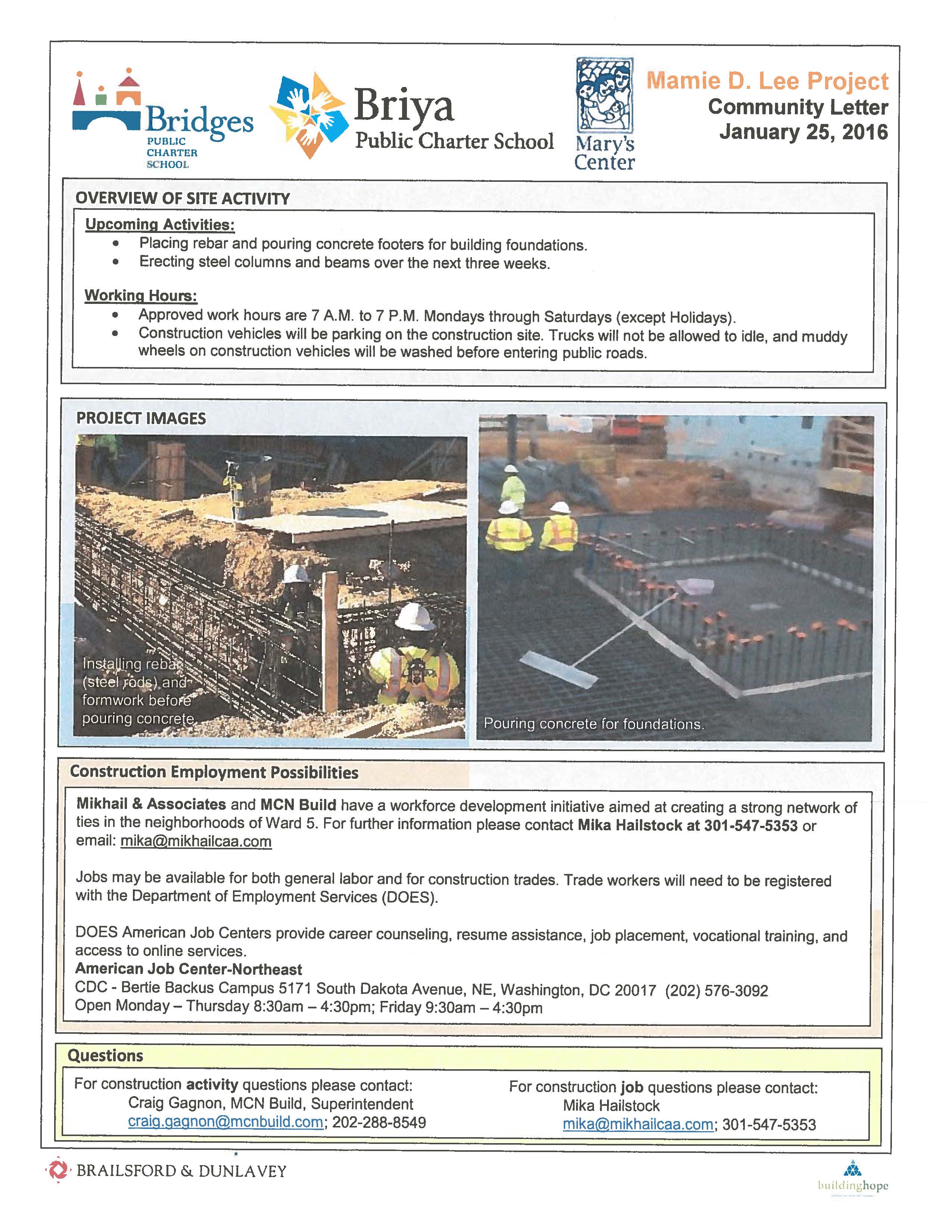 A community flyer was available with updates on construction progress for Briya Bridges Public Charter School and Mary’s Center, which will occupy the former Mamie D. Lee school building at 100 Gallatin Street NE. The flyer also contains contact information for construction employment and construction activity inquiries.