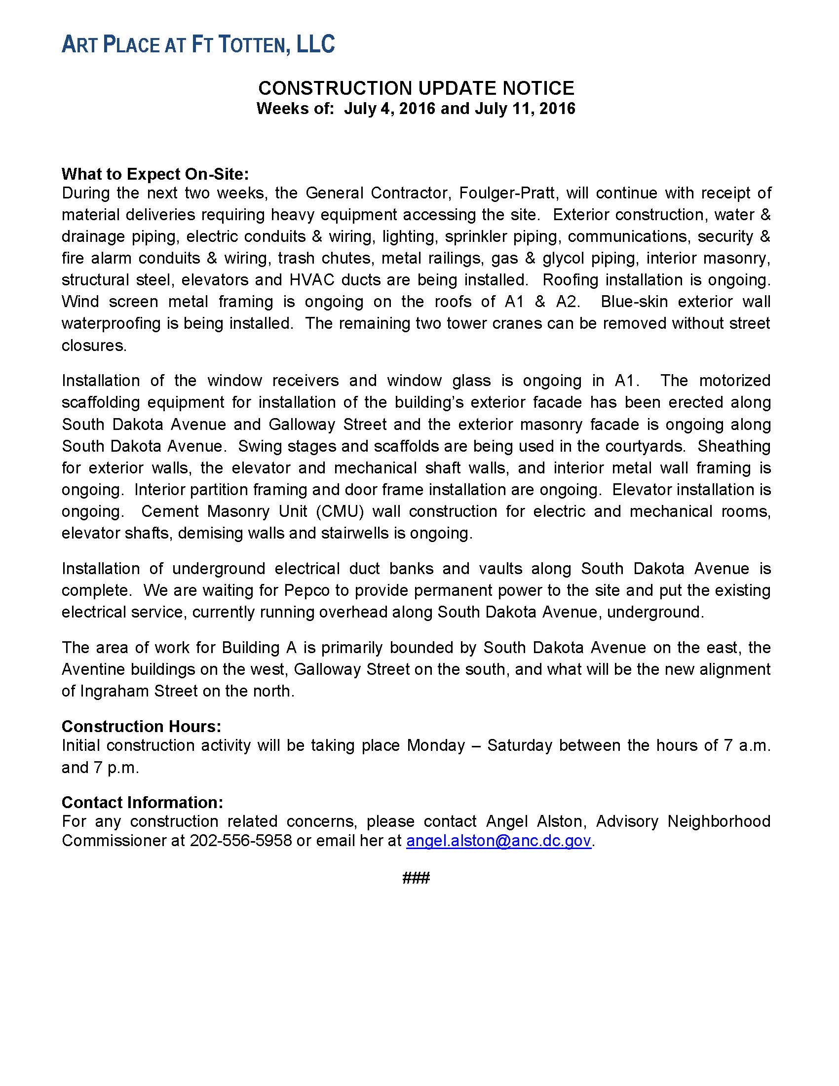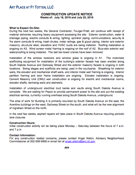 Art Place Construction Notice 7/18/2016 & 7/25/2016