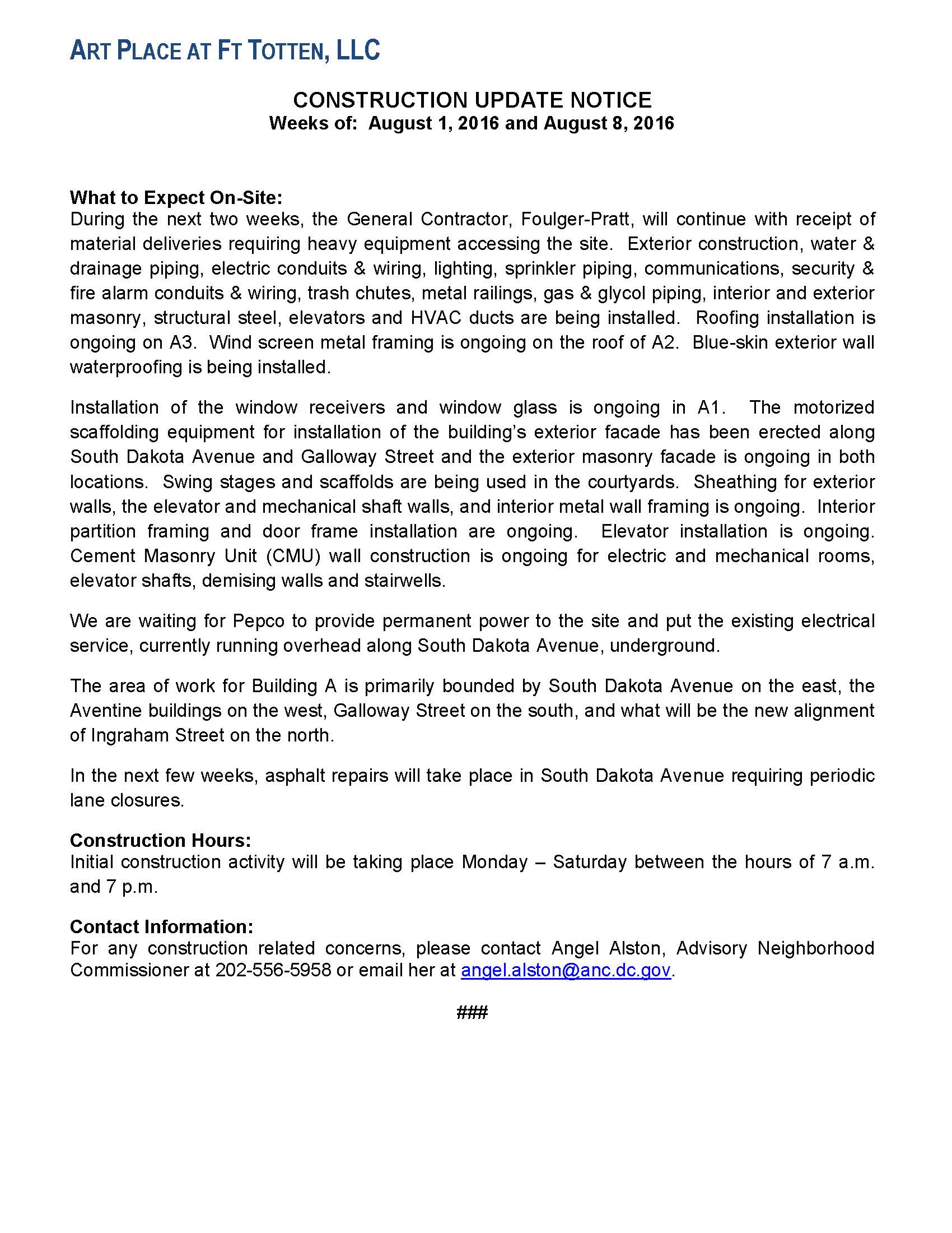 Art Place – Construction Notification Weeks of Aug 1 2016 thru the week of Aug 8 2016 FINAL
