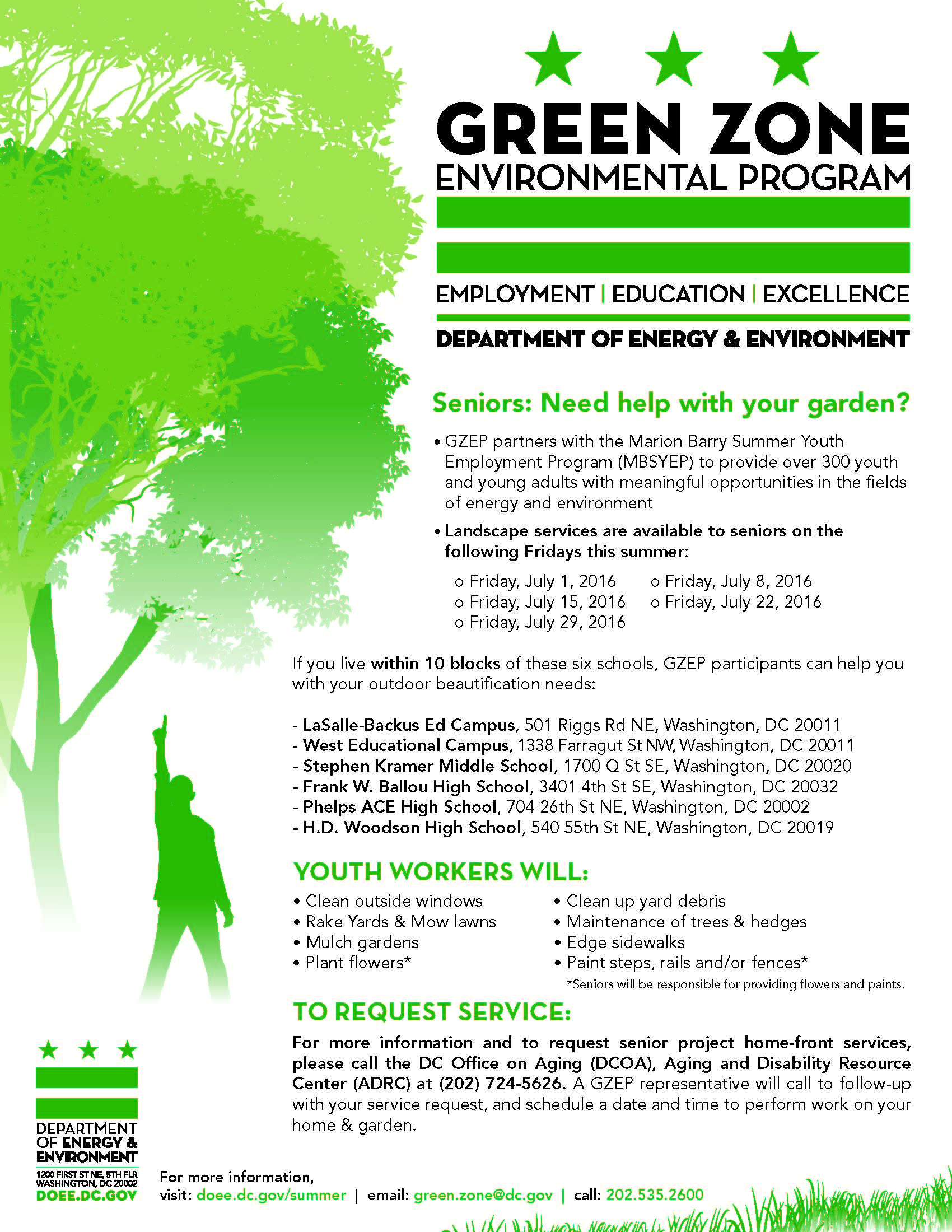 Spread the word to senior neighbors in the neighborhood. Free landscaping help available July 22 and July 29 for seniors who live within 10 blocks of LaSalle-Backus Education Campus (501 Riggs Road NE). To request assistance, call the DC Office on Aging (DCOA) at (202) 724-5626.