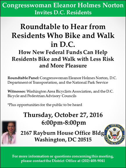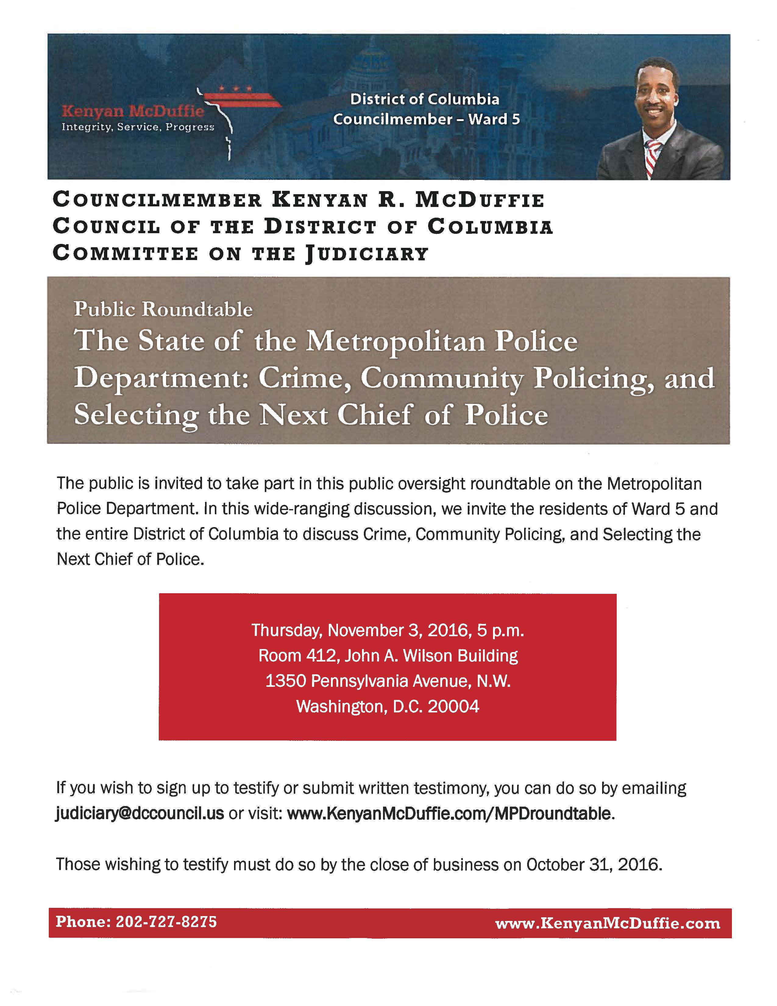 And finally, the councilmember will be holding a roundtable on the state of MPD at 5:00 pm on November 3, 2016, at the Wilson Building.