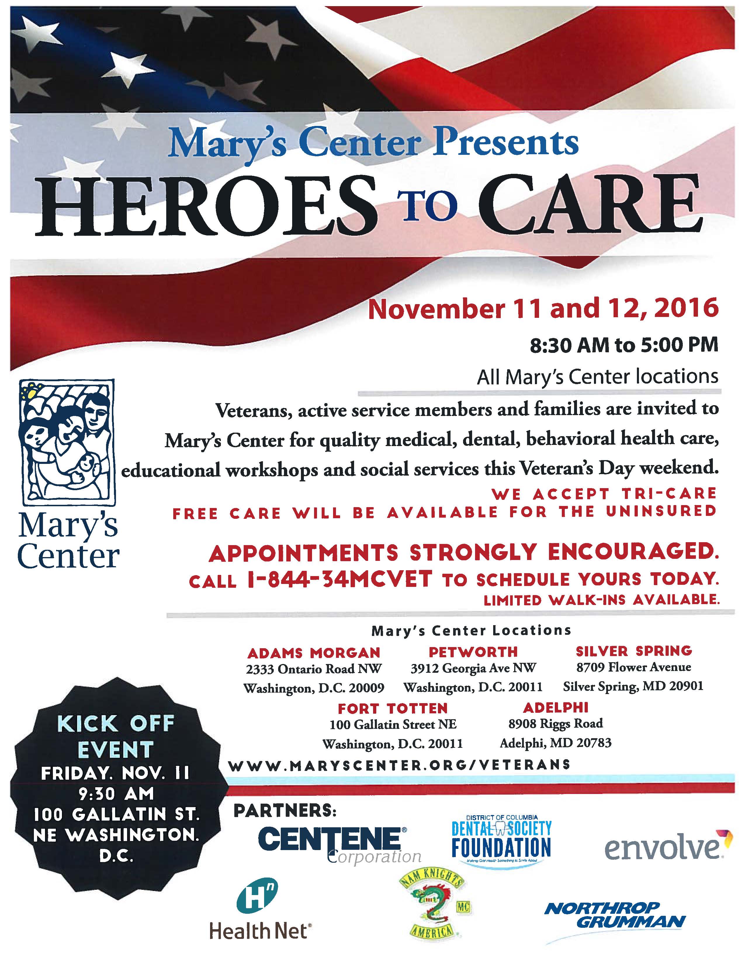 Mary’s Center at Fort Totten (100 Gallatin Street NE), the medical facility operating in partnership with Briya & Bridges Public Charter School, will officially open December 1, 2016. They will be holding a Veterans Day event on November 11, 2016, at 9:30 am for veterans, active duty servicemembers, and their families. Appointments are strongly encouraged. To make an appointment call 1-844-346-2838 or email MCVET@maryscenter.org.