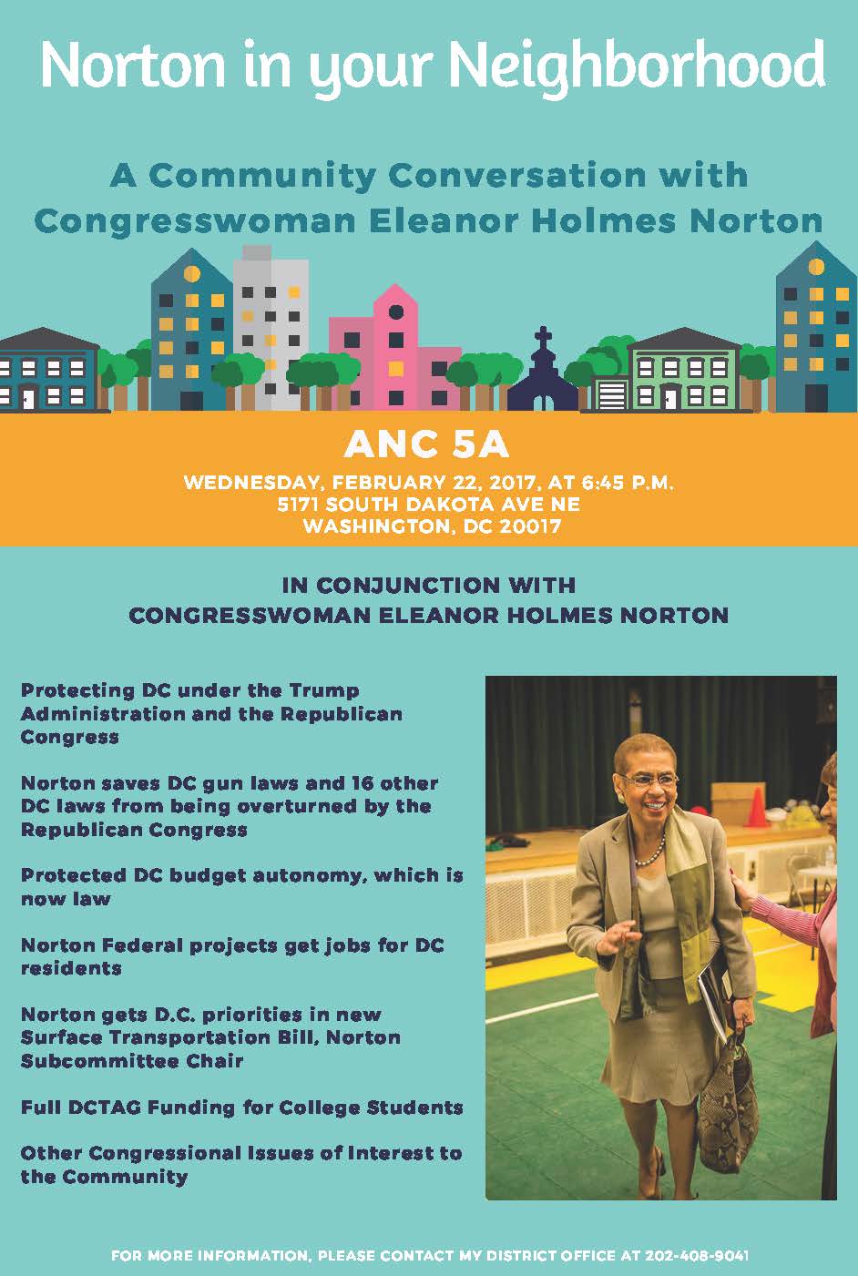 February 22: ANC 5A Public Meeting with Congresswoman Eleanore Holmes Norton Posted by nextstoprp in ANC 5A February 17, 2017 anc5a-feb-2017-meeting-notice Norton in Your Neighborhood with ANC 5A Wednesday, February 22, 2017 6:45 pm UDC-CC Backus Campus (5171 South Dakota Ave. NE) Share this: Click to share on X (Opens in new window) X Click to share on Facebook (Opens in new window) Facebook Click to share on X (Opens in new window) X Click to email a link to a friend (Opens in new window) Email Click to print (Opens in new window) Print Like Loading... Related