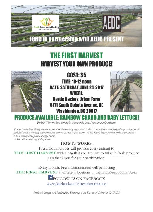 The First Harvest event scheduled for June 24 at the Backus Urban Farm has been cancelled. From the organizer Fresh Communities Holding Corporation :