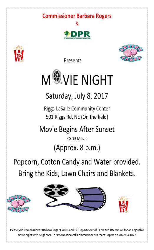 On July 8, 2017, join ANC Commissioner Barbara Rogers (4B08) and the Department of Parks and Recreation for a PG-13 movie night on the field at Riggs-LaSalle Recreation Center (501 Riggs Road NE). Popcorn, cotton candy, and water provided. Bring the kids, blankets, and lawn chairs.