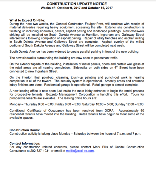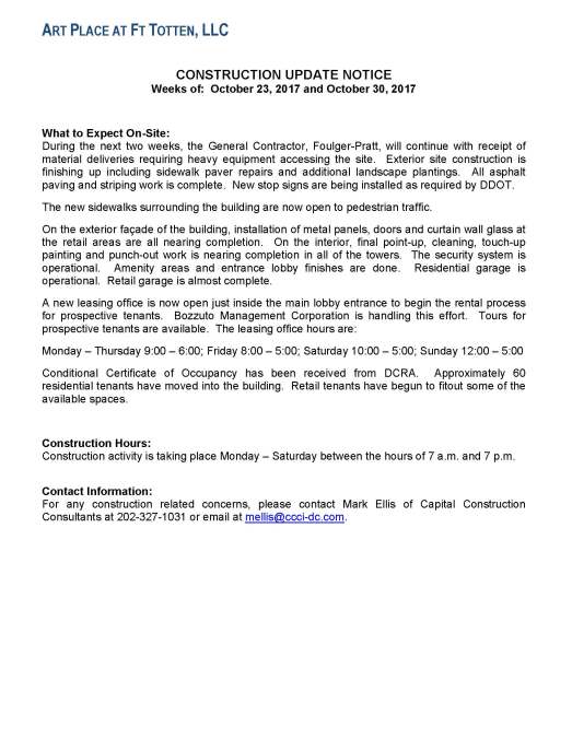 Marriott has appeared before the ANC several times for support of its long planned project consisting of a hotel (160-room Residence Inn and 100-room Courtyard by Marriott), ground floor retail, and residences near Michigan Avenue and Irving Street NE. The property is federal property which was transferred to the District for hotel “and other compatible uses.” The developer and District officials had assumed all this time that residential use would be considered a compatible use, but apparently GSA does not believe residential use is a compatible use with a hotel. Marriott is working with District officials and Congresswoman Eleanore Holmes Norton’s office to get GSA to permit residential use. The Commission passed a resolution to send a letter to Congresswoman Norton in support of the project, including residential use as a compatible use.