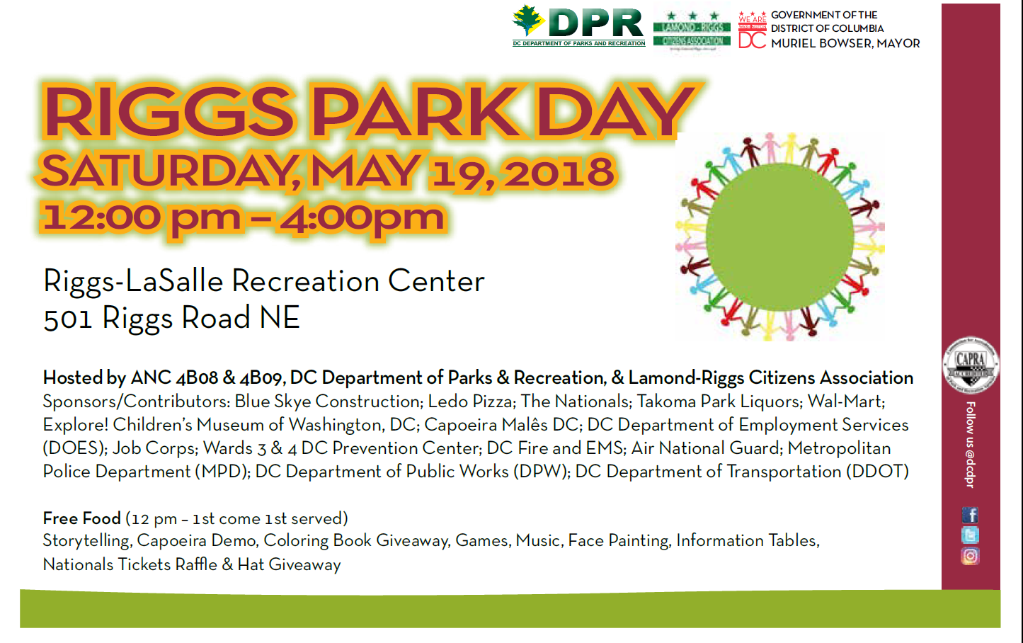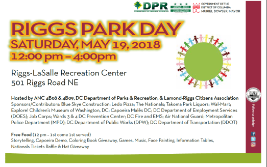 Riggs Park Day is still on tomorrow! Come on out to the Riggs-LaSalle Recreation Center, located at 501 Riggs Road NE, 12:00 pm to 4:00 pm. Free food and beverages will be served starting at 12 :00 pm. Come early and get it while it lasts. Snacks will be available throughout the day.