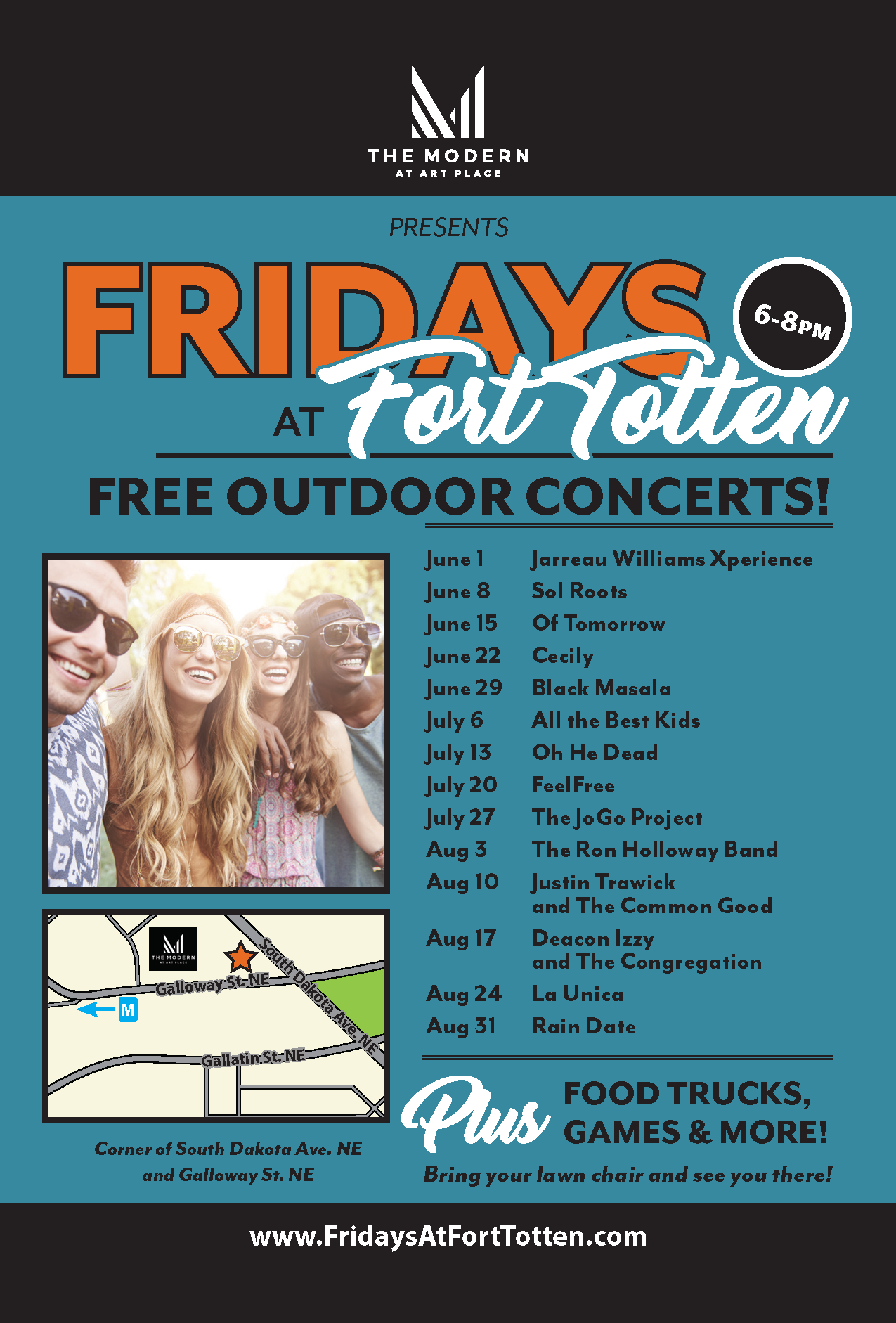 Fridays at Fort Totten Concert Series continues tomorrow with live music by Justin Trawick & The Common Good and eats by Carnivore BBQ food truck. 6pm-8pm on the corner of South Dakota Avenue & Galloway Street NE. Bring a blanket or lawn chair for seating. Sponsored by On Tap Magazine and The Modern at Art Place.
