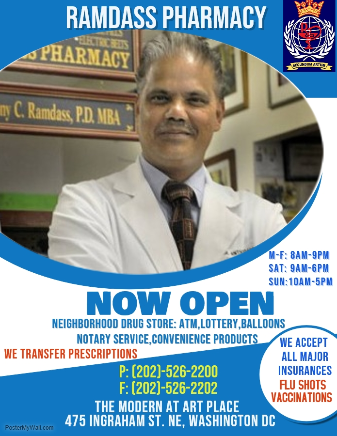 Ramdass Pharmacy, an independent, locally-owned pharmacy and convenience store, is now open at 475 Ingraham Street NE. Conveniently located just steps from Fort Totten metro station, the pharmacy is the second business to open in the Art Place at Fort Totten development.