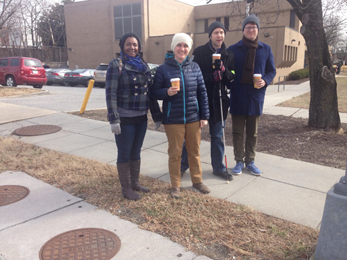 Neighbors and AWSStacy from AWS pointing to a storm drain near the library