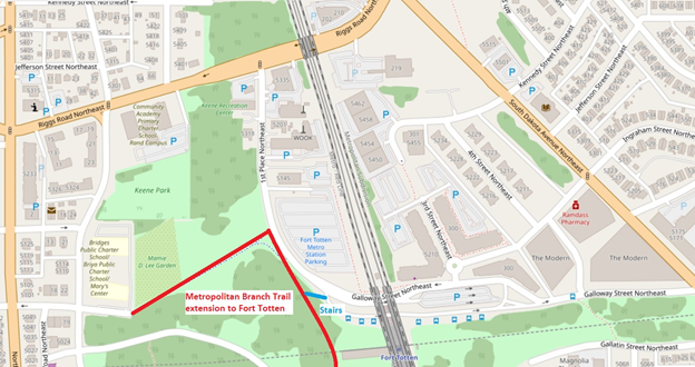 The Metropolitan Branch Trail (MBT) is a multi-use trail that will run from Silver Spring to Union Station when completed. Today, the trail segment connecting Fort Totten to the south is under construction and expected to open in 2020. When it opens, Lamond-Riggs and adjacent neighborhoods will have access to a great facility for walking, jogging, and biking. To access the MBT, the Fort Totten trailhead will be located on 1st Place NE, just west of the Fort Totten Metro station. The trailhead will connect to the sidewalk network, as well as the trail spur that connects west to Gallatin Street NE (which will be repaved as part of this project).