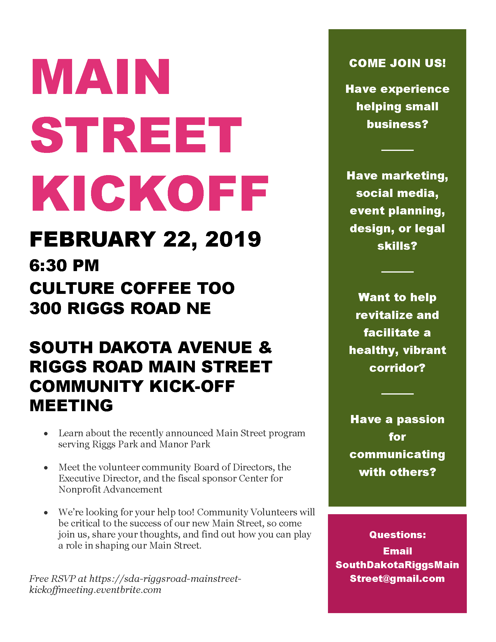 Thanks to all who attended the community kick-off meeting for the South Dakota Avenue & Riggs Road Main Street program. Through this initiative, we aim to organize improvement efforts for the commercial corridors located on South Dakota Avenue and Riggs Road in Lamond-Riggs as well as 3rd Street NW in Manor Park.