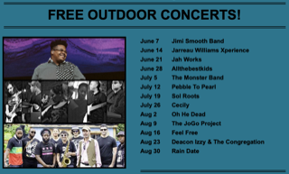 June 7 – Jimi Smooth Band June 14 – Jarreau Williams Xperience June 21 – Jah Works June 28 – Allthebestkids July 5 – The Monster Band July 12 – Pebble to Pearl July 19 – Sol Roots July 26 – Cecily August 2 – Oh He Dead August 9 – The JoGo Project August 16 – Feel Free August 23 – Deacon Izzy & The Congregation August 30 – Rain Date