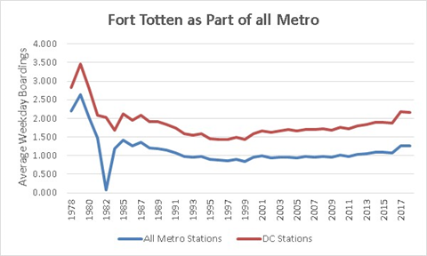 Figure 2 shows the percent of average weekday boardings at the Fort Totten metro station compared to boardings across all metro stations (lower line) and metro stations in the District (higher line) between 1978 and 2018