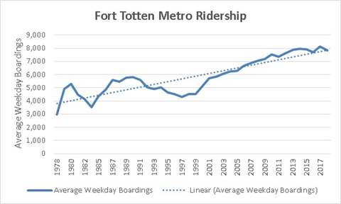 While searching the Public Records available on the Washington Metropolitan Area Transit Authority’s (WMATA’s) website, I did find a few nuggets of ridership data related to Fort Totten metro that I’d like to share (see the original source data here and my manipulations on this Excel sheet here). WMATA publishes historical ridership figures for each station going back to 1977, with Fort Totten coming online a year later (read these articles here and here to see how residents felt about it back then). Figure 1 displays the average number of weekday boardings per year at the Fort Totten station from 1978 to 2018 (data for 1983 were not available). Note, I assume “boardings” in Metro language refers to those who passed through a faregate, not simply transferred to another train (e.g., red line to green line). Boardings grew from 2,969 on an average weekday in 1978 to 7,842 four decades later. Note, these data represent actual average weekday boarding counts and not normalized to population change.