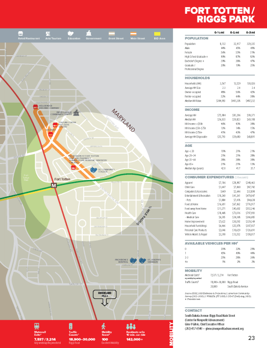 The Washington, DC Economic Partnership released the 2019 Neighborhood Profiles. View the profile sheet for Riggs Park here. It is exciting to see some new additions to the neighborhood’s profile, including mention of the tenants secured for the second phase of Art Place at Fort Totten (Meow Wolf and Aldi) and 24 Hour Fitness for the first phase of the project. The profile also highlights the extension of the Metropolitan Branch Trail from Brookland to Fort Totten and the forthcoming EYA mixed-use townhome project, which will feature roughly 160 townhomes and approximately 25,000 square feet of retail. It even has the contact information for the new neighborhood Main Street. The only thing missing from the profile is the neighborhood library’s upcoming $20 million rebuild! All in all, this profile sheet provides a cool, compact visual of the development on deck and a snapshot of the demographics in the neighborhood.