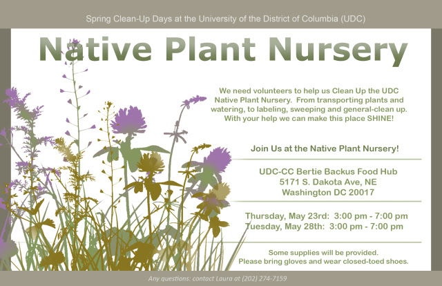 UDC is seeking volunteers to assist with cleanup of its native plant nursery located at the Bertie Backus Food Hub at UDC-CC Backus, 5171 South Dakota Avenue NE.