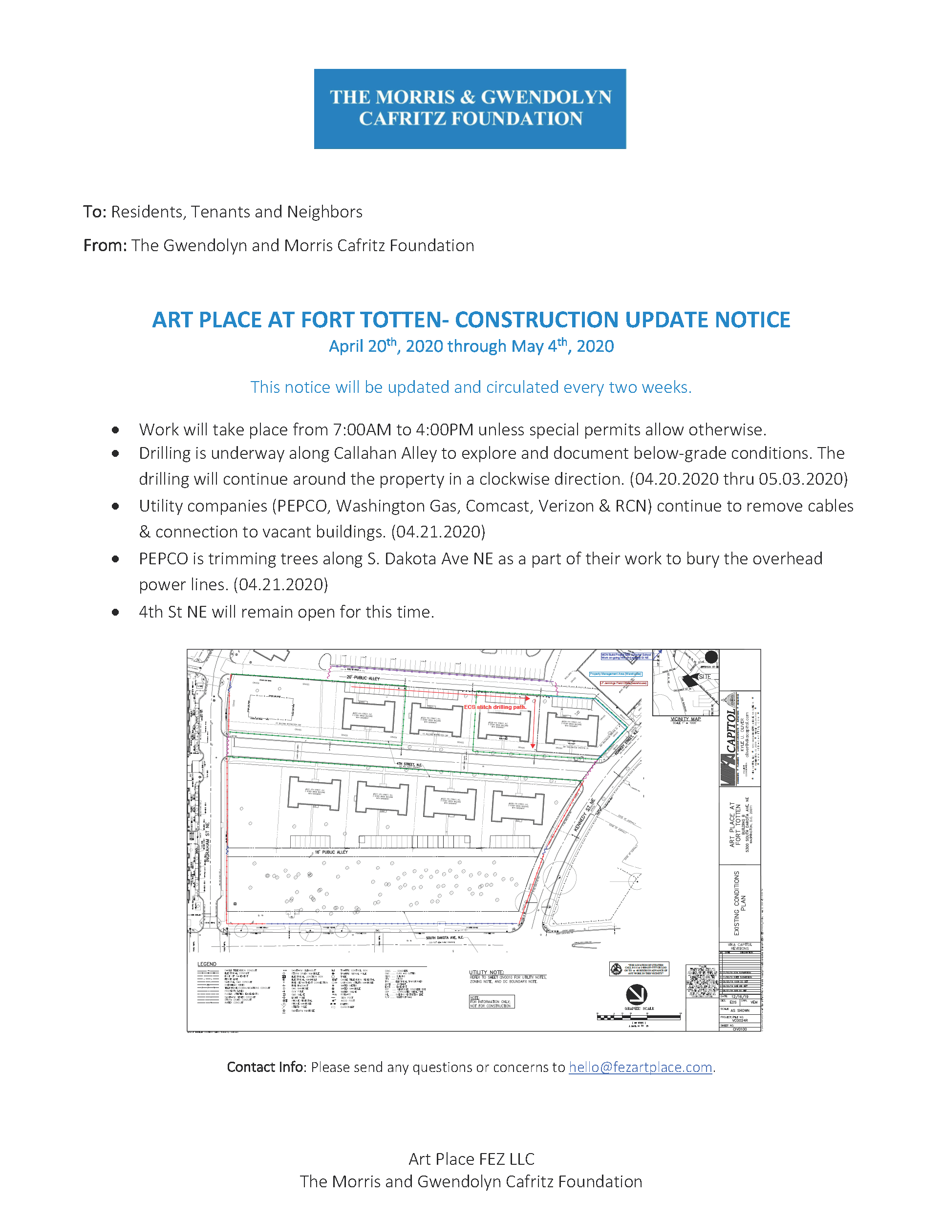The first biweekly construction notice to the community has been distributed. Currently, drill rigs are testing soil borings throughout the site. They are proceeding with getting permits for excavation and disconnecting utilities to 7 of the 8 vacant Riggs Plaza apartment buildings. They hope to be under full construction on Block B by July 6, 2020. Construction questions may be sent to hello@fezartplace.com.