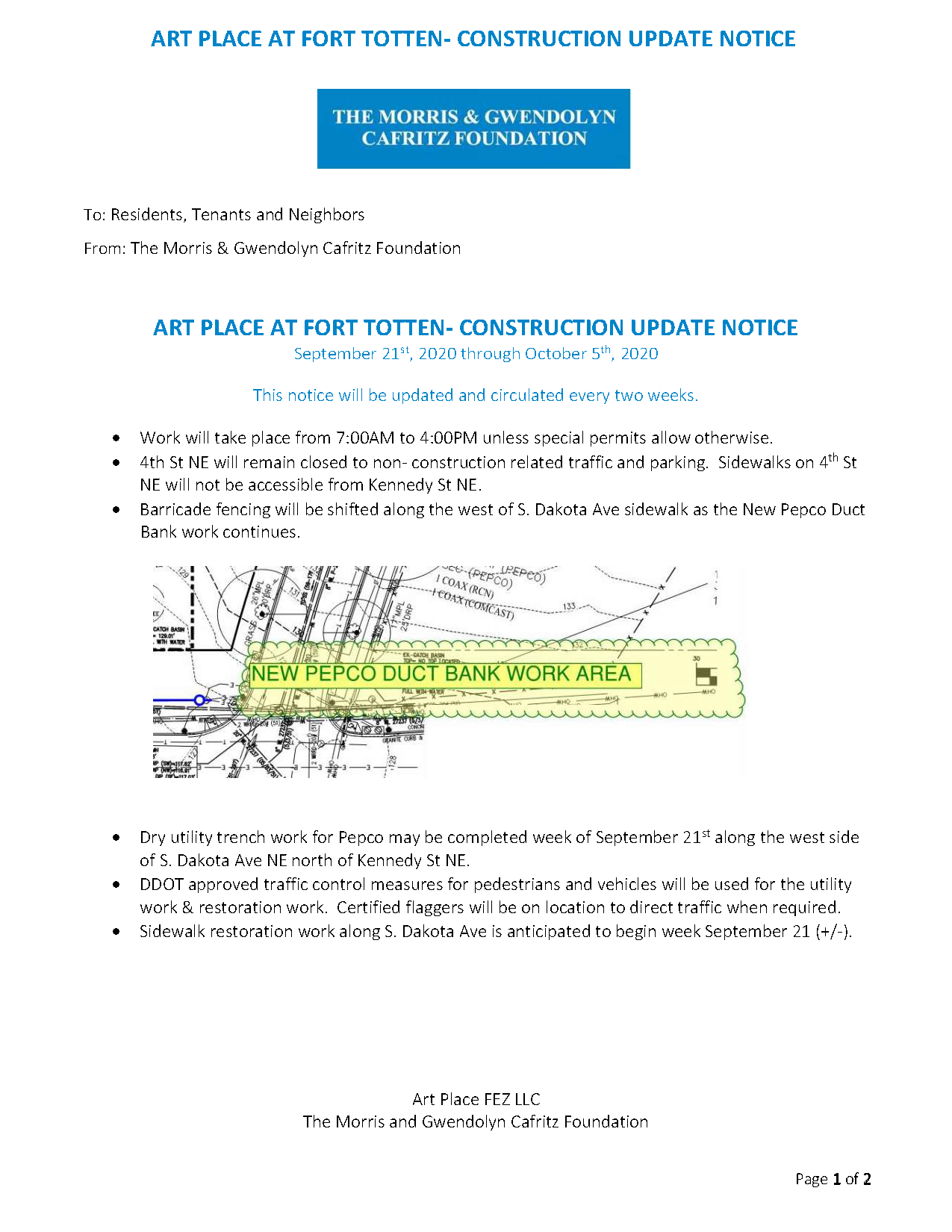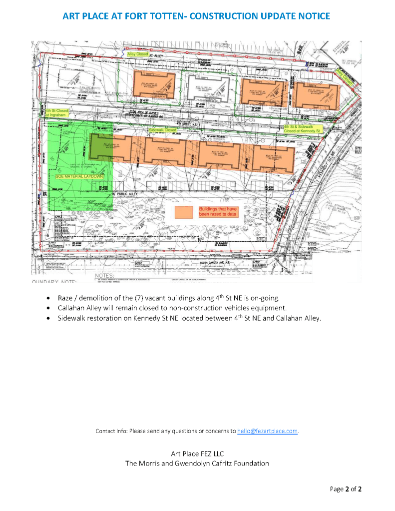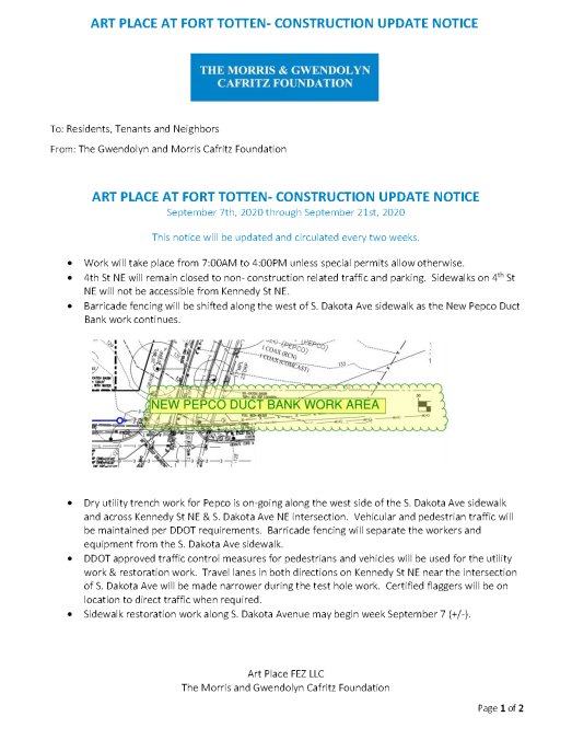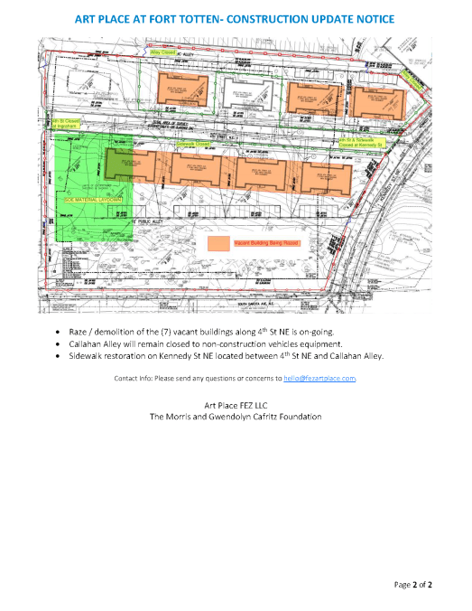 An update on Art Place at Fort Totten was originally on the agenda, but was removed by Commissioner Fletcher. He will provide an update at a future meeting.
