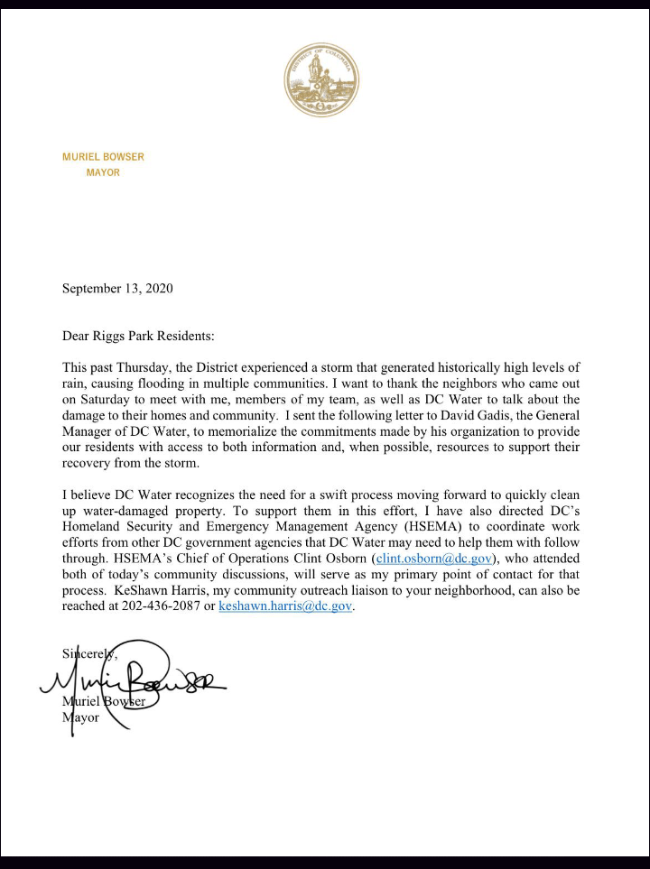 For those impacted by flooding and sewer backup issues as a result of the storm on September 10, DC Water has a resource page at https://dcwater.com/storm-and-flooding-september-10-2020. DC Water has established a cleanup fund using two vendors. Residents who still need to dewater, clean, and sanitize their homes should contact the vendors directly: (1) Service Master at (703) 212-7000 or (2) ServePro at (703) 448-8444. DC Water will pay the vendor directly.