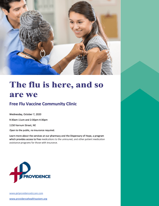 Providence will have a free community flu shot clinic on October 7, 2020, from 9:30 am to 11:00 am and from 2:30 pm to 4:30 pm.