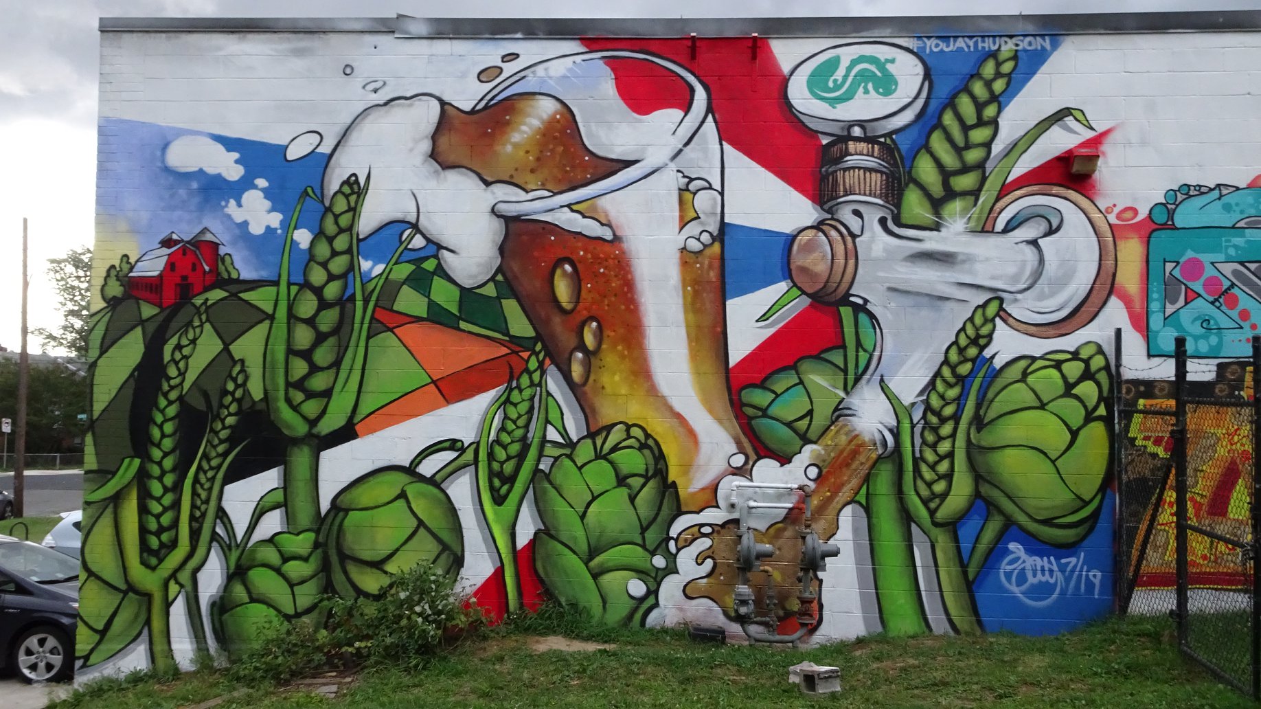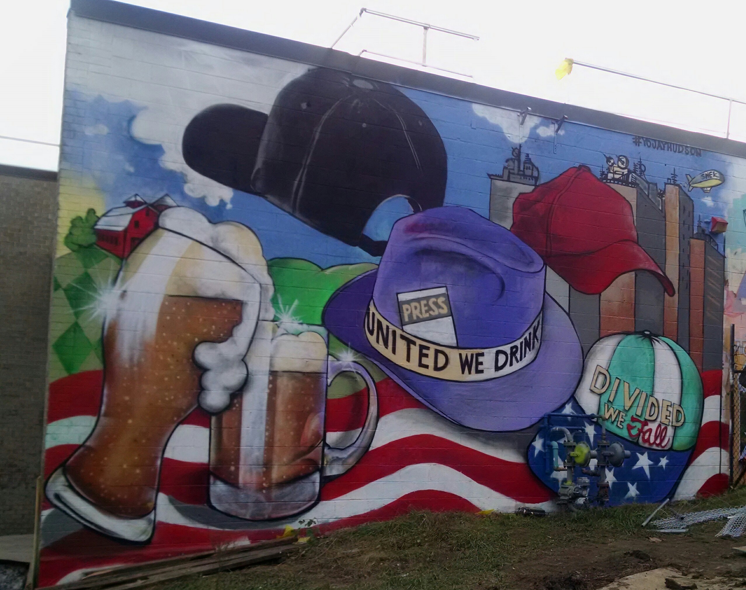 Muralist Jay Hudson painted a new mural, “Divided We Fall, United We Drink” at Hellbender for a scaled-down Riggs Park Art Crawl and Hellbender’s sixth anniversary. Hellbender is located at 5788 2nd Street NE.