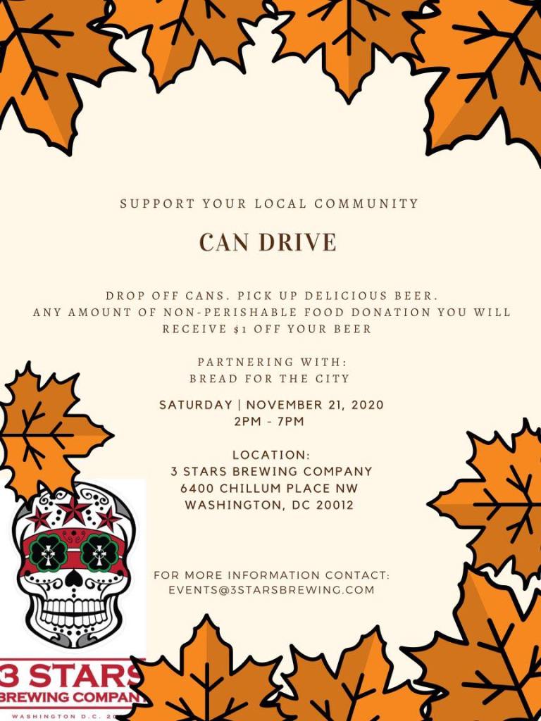3 Starts Brewing in Lamond is hosting a nonperishable food drive this Saturday, November 21, 2:00 pm to 7:00 pm. Drop off nonperishable foods and get one dollar off beer. Special request for low-sodium and whole grain products. Local vendors will also be selling unique holiday gifts from 2:00 pm to 4:00 pm. The brewery is located at 6400 Chillum Place NW.