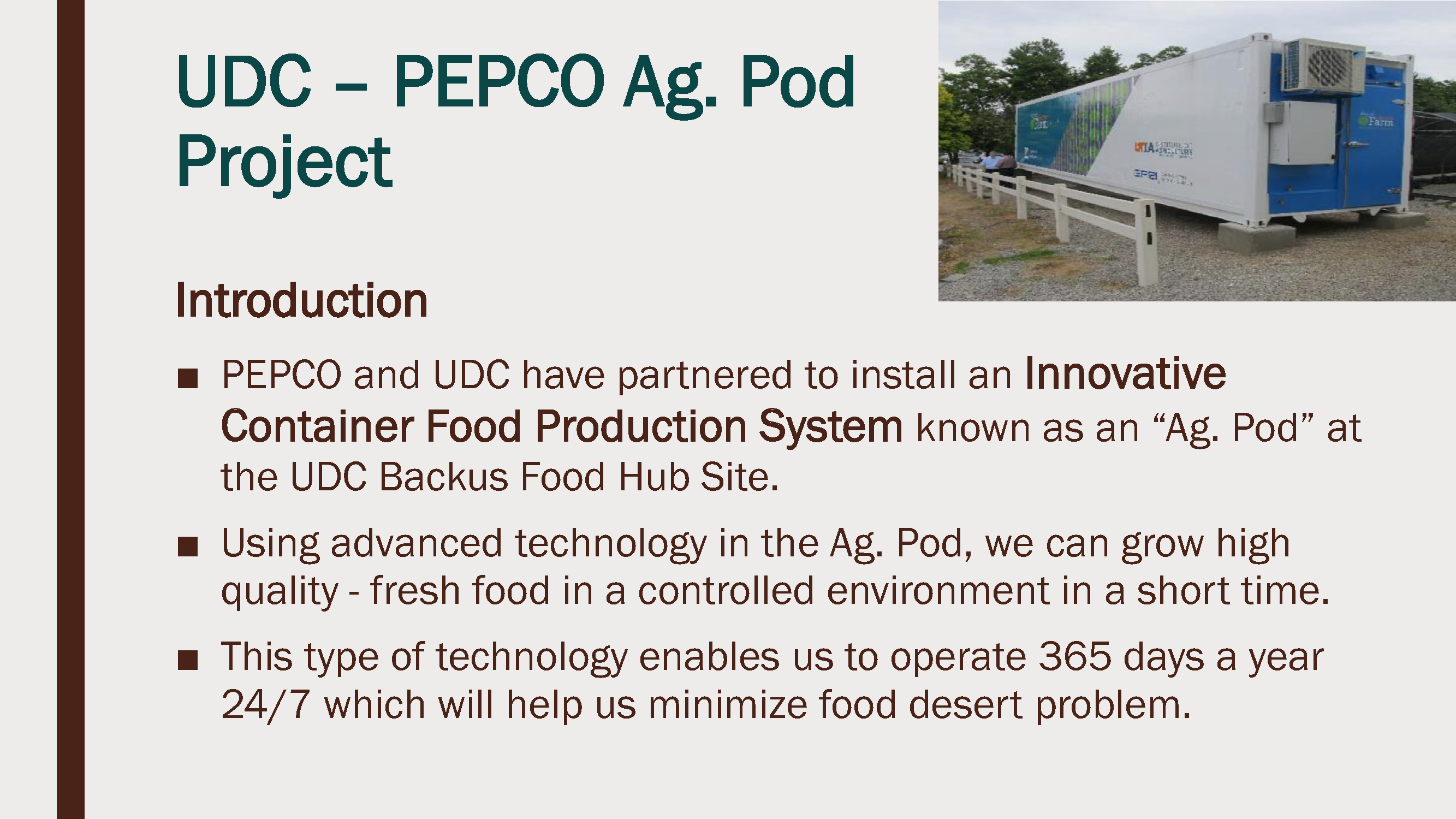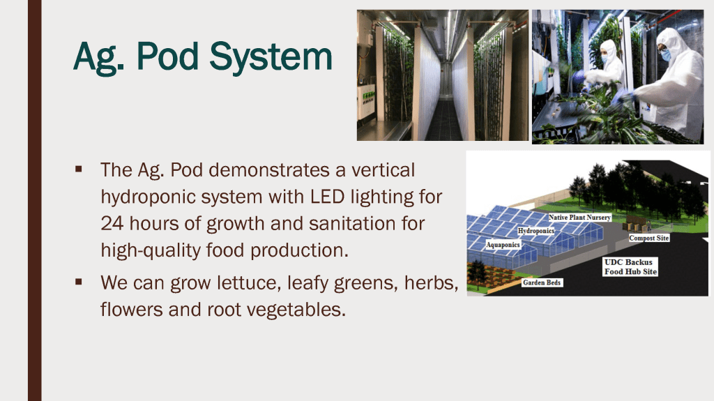 There will soon be a new addition to the Bertie Backus Food Hub housed at UDC’s Backus campus (the large hoop houses visible on the Galloway Street NE side of the campus). At ANC 5A’s recent meeting, Acting Director of UDC CAUSES Dr. Kamran Zendehdel shared that UDC is teaming up with Pepco to house an “Ag. Pod” at the food hub. This food production system will be used to grow vegetables and herbs year round to supply food in food desert areas around the city. The team is working on an entrepreneurial training model to train interested residents in Wards 5, 7, and 8. Currently, the Backus food hub contains a hydroponics system, aquaponics system, native plant nursery, compost, and community garden. Buildout of a community incubator commercial kitchen that will be accessible at low cost is also in progress.