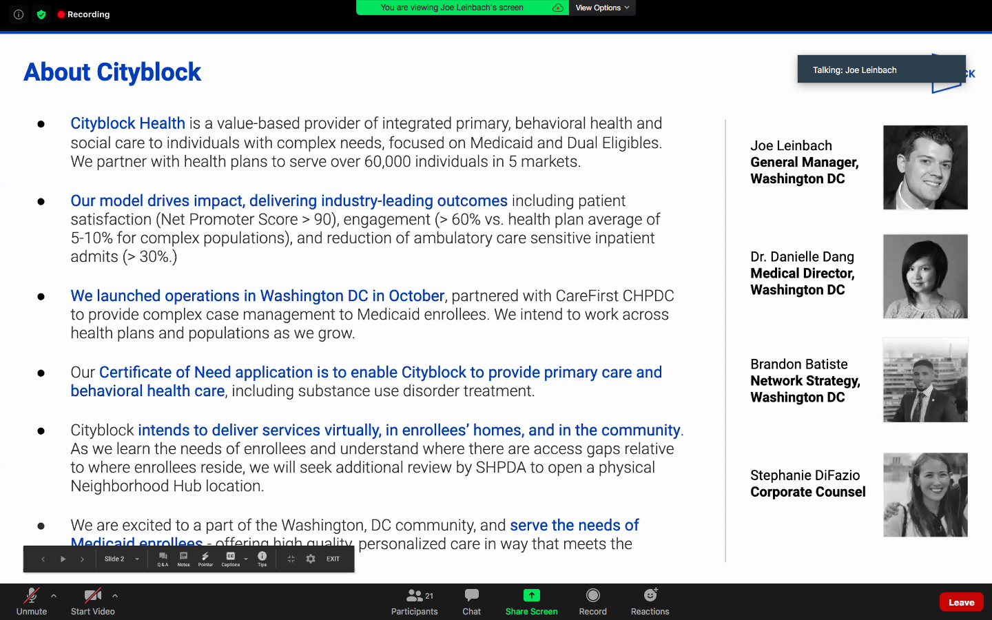 CityBlock Health Services is seeking citywide support for its certificate of need application to DC’s State Health Planning and Development Agency (SHPDA) to establish “ambulatory community based health services.” Cityblock serves clients primarily in Wards 5, 7, and 8. They are not looking to open a physical location in ANC 5A; they are simply doing community outreach to councilmembers and ANC communities in which they provide services.