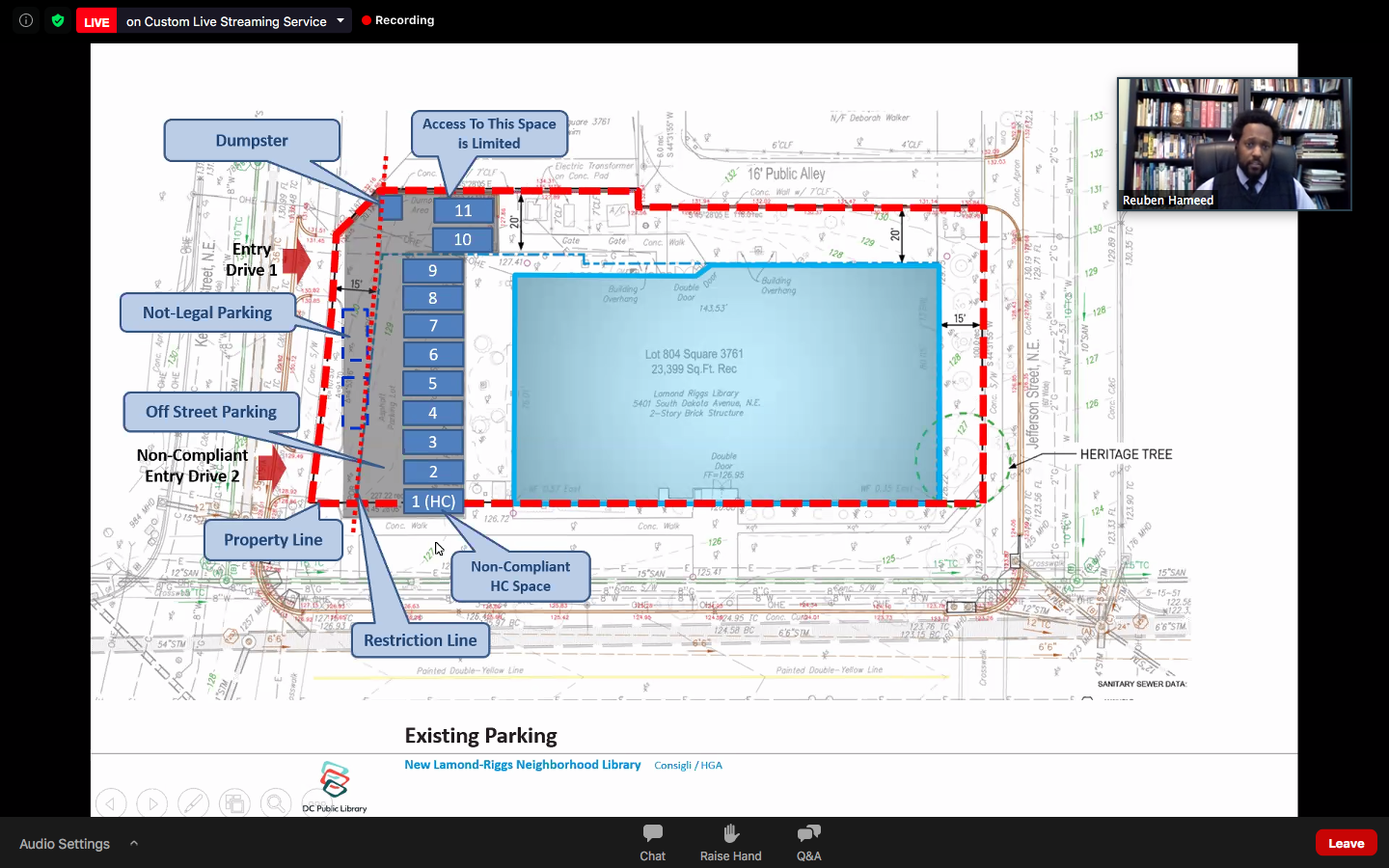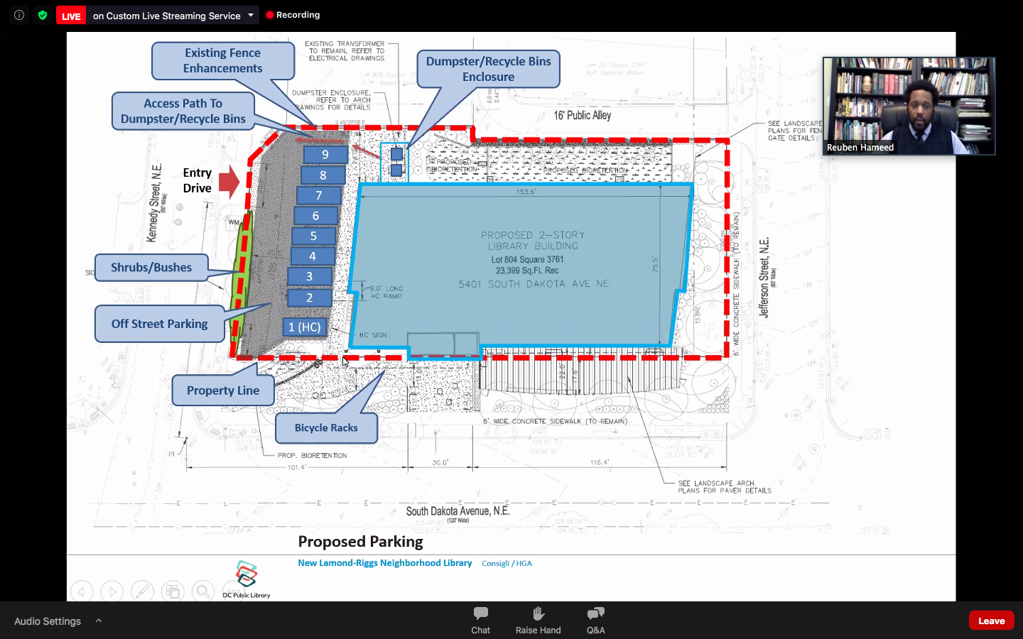 The other request concerns relief from minimum vehicle parking requirements. The library is supposed to have a minimum of 11 vehicle parking spaces. The existing library does have 11 spaces, but one is a noncompliant handicap space because it is outside of the lot line and another one has limited access because of its location next to the library’s dumpster. The new library will only have 9 parking spaces, one being a fully compliant handicap parking space, because of site constraints and the amount of amenities that need to be accommodated on the lot. The BZA case number is 20392. The hearing will be on January 13, 2021.