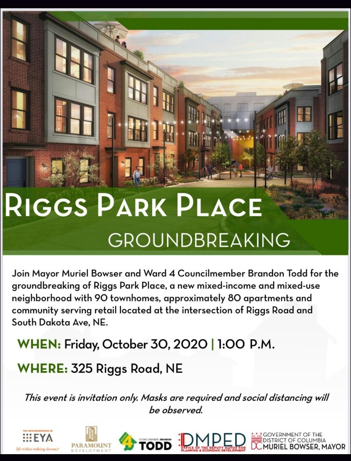 On October 30, 2020, Mayor Muriel Bowser broke ground on Riggs Park Place, a new EYA townhome community at the corner of South Dakota Avenue and Riggs Road NE that will have 90 townhomes (five below market rate), 80 rental units for seniors, and retail. The project will be built in two phases beginning with the townhomes. Over 50 percent of the homes have been sold.