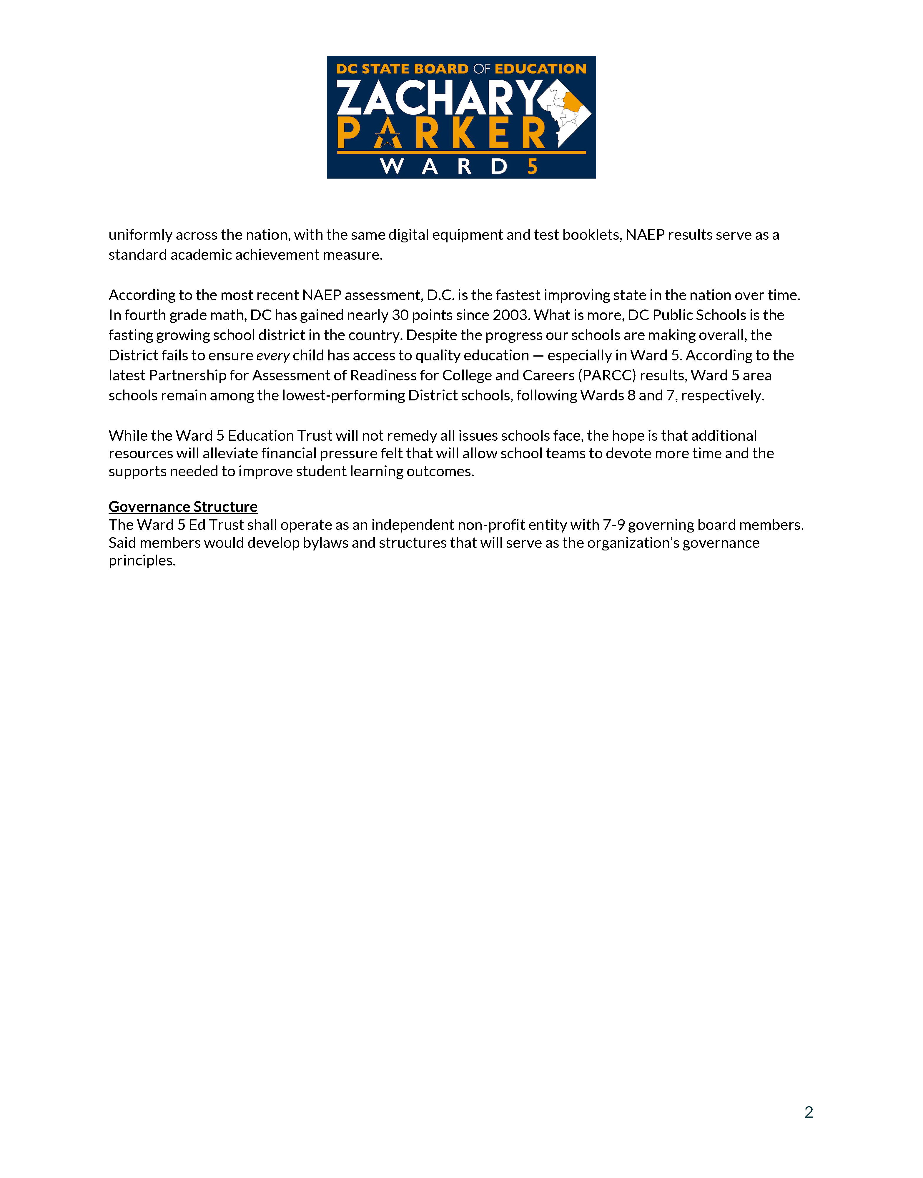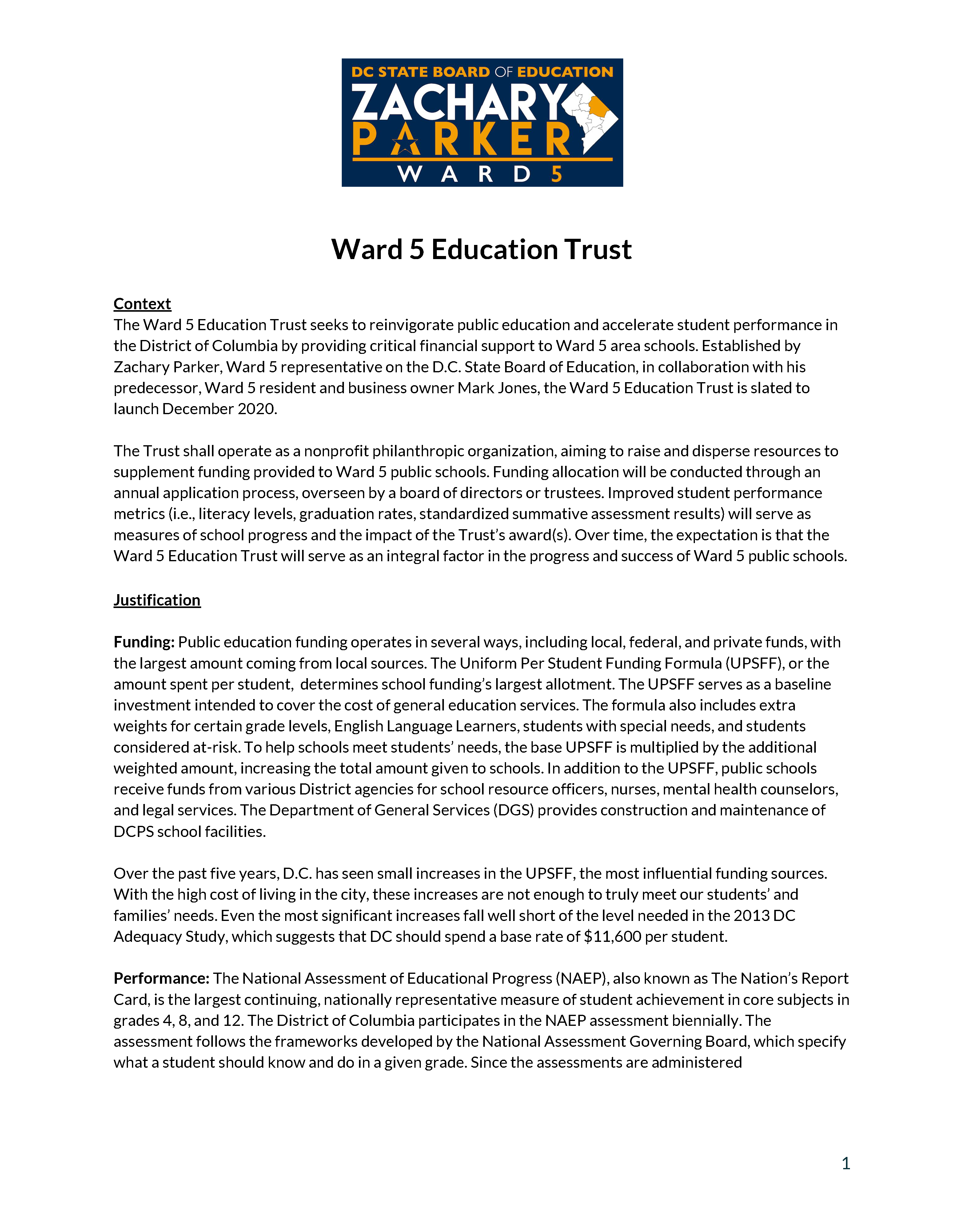 Mr. Parker and his predecessor Ward 5 SBOE representative Mark Jones are standing up an organization called Ward 5 Education Trust to provide financial support to Ward 5 public schools.