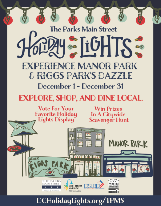 Last night, several of the DC Main Streets came together to celebrate DC Holiday Lights, a citywide intiative to encourage residents and visitors to shop small this holiday season. Participating small and local businesses adorned their storefronts with holiday displays, earning a chance for recognition in several award categories. I was a judge for businesses in The Parks Main Street (TPMS) corridors in Riggs Park and Manor Park, along with four other judges: Joseph Gibbs, Lamond-Riggs resident and chair of the TPMS design committee; Ray Crawford, Manor Park resident and member of the TPMS design committee; Cam, Ray’s son and a student at Shepherd Elementary School; and Zara, Riggs Park resident and student at LaSalle-Backus Education Campus.