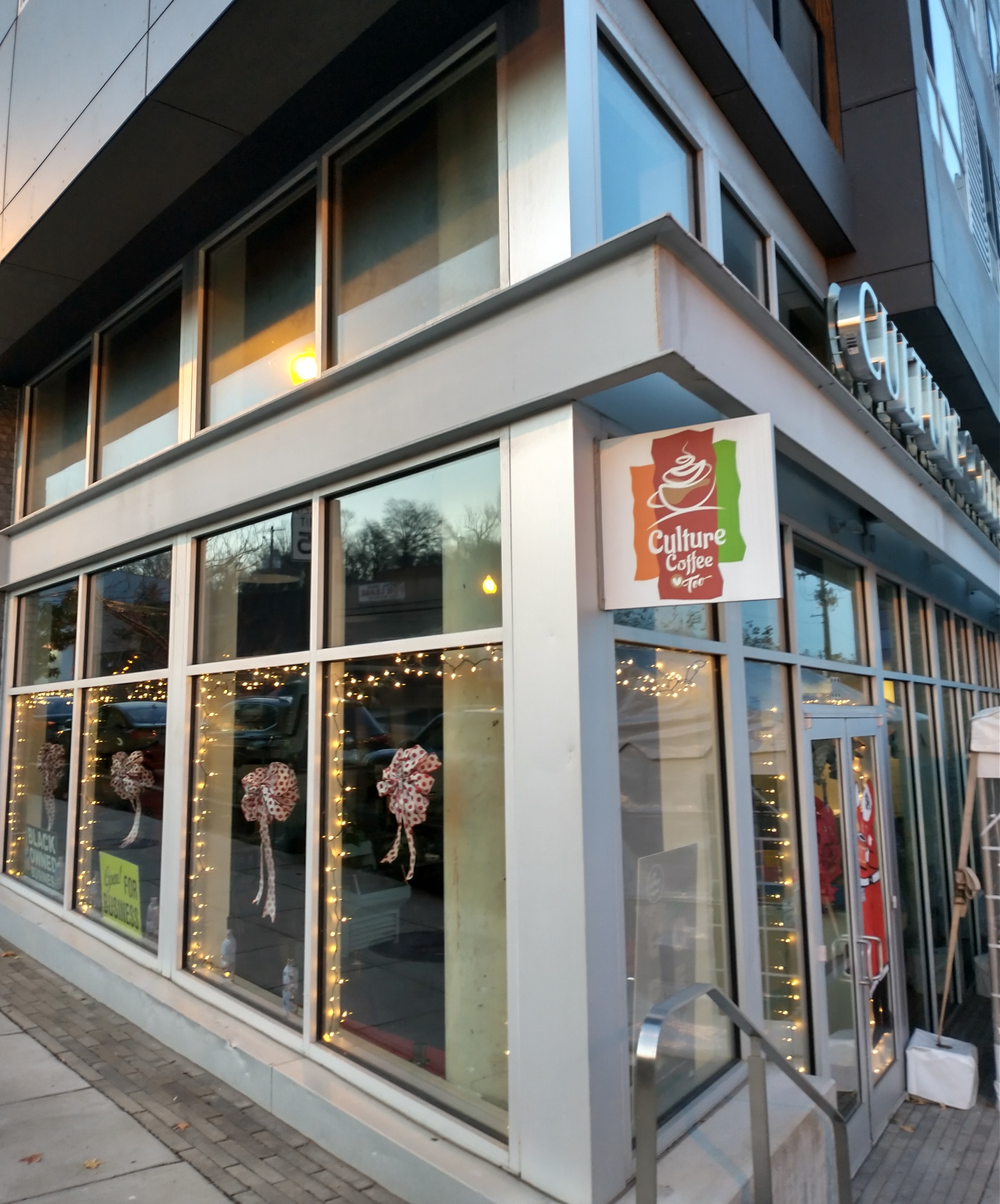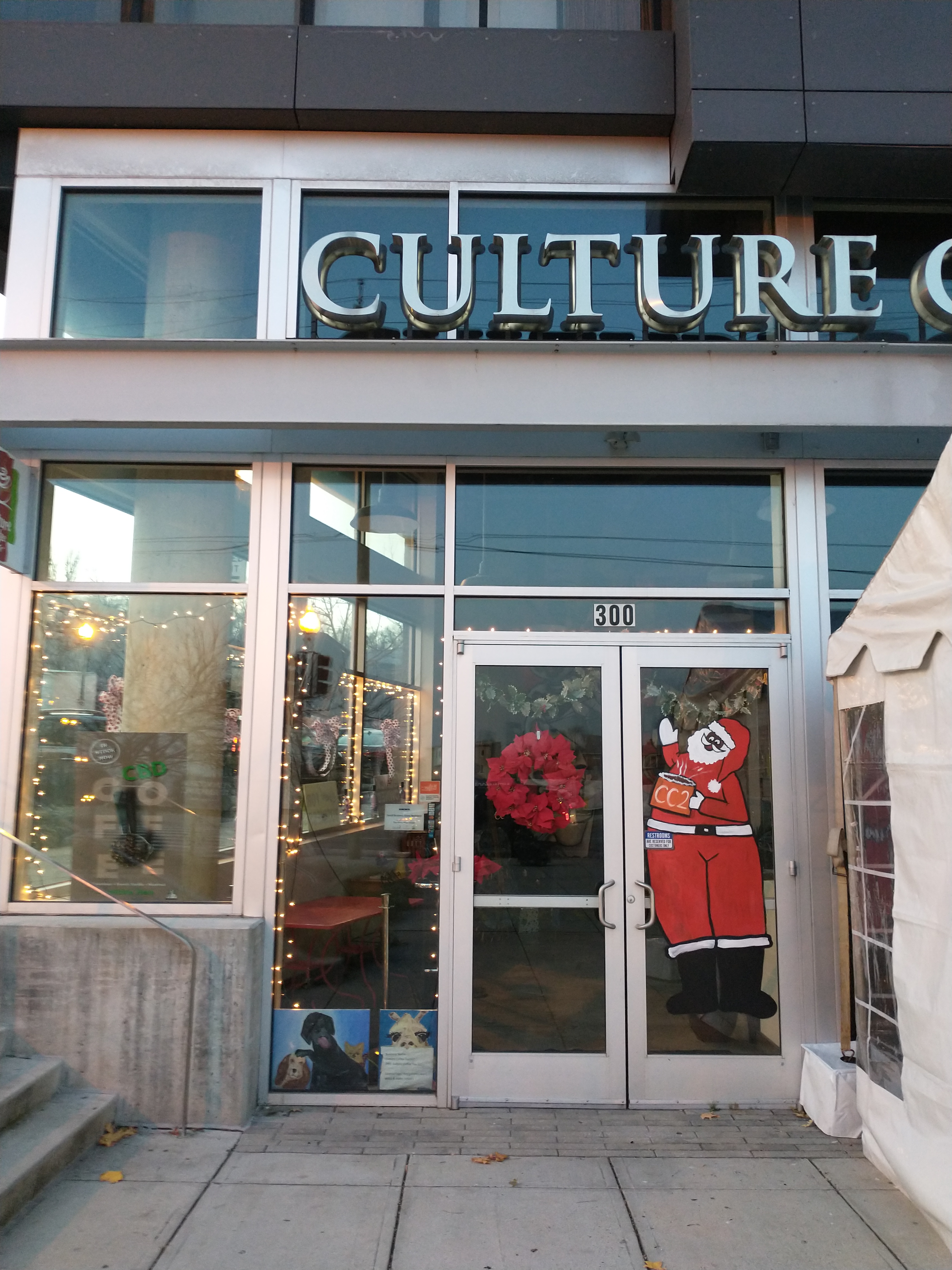 Culture Coffee Too also had one of my favorite displays. All of the windows are beautifully and elegantly lit and adorned with holiday bows, and a coffee-drinking Santa Claus door display greets visitors.