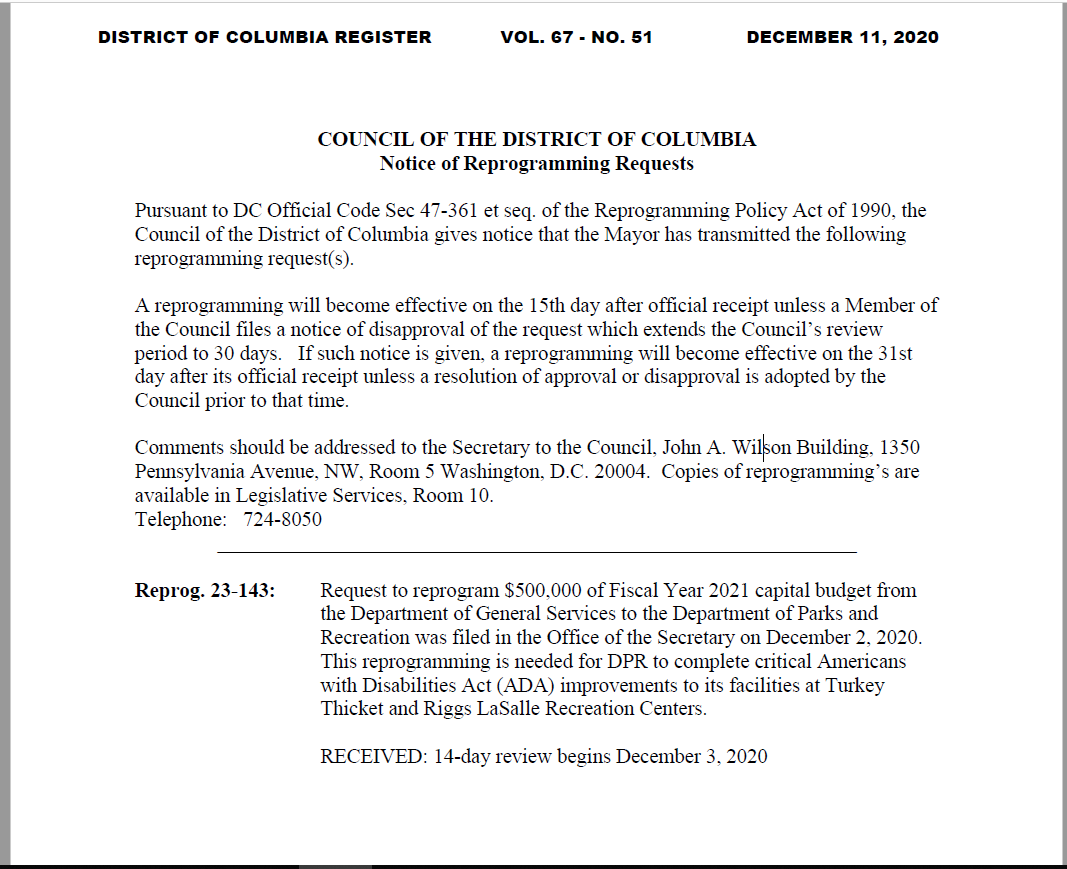 According to the December 11, 2020, issue of the DC Register, the District’s Department of General Services submitted a reprogramming request on December 2, 2020 to move $500,000 to the District’s Department of Parks and Recreation (DPR). The Register notes the request is needed to complete critical Americans with Disabilities Act (ADA) improvements to the DPR Turkey Thicket and Riggs LaSalle Recreation Centers. The Council has a fourteen day review period for the request, unless they file a Notice of disapproval, extending the clock to 30 days.