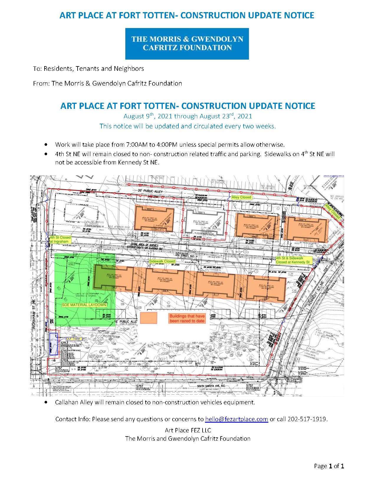 - The Cafritz Foundation states they will abide by proposed mitigations in the original PUD–full traffic signal at South Dakota Avenue & Ingraham Street NE, pedestrian improvements on Ingraham Street, improvements on South Dakota Avenue NE and on Kennedy Street NE