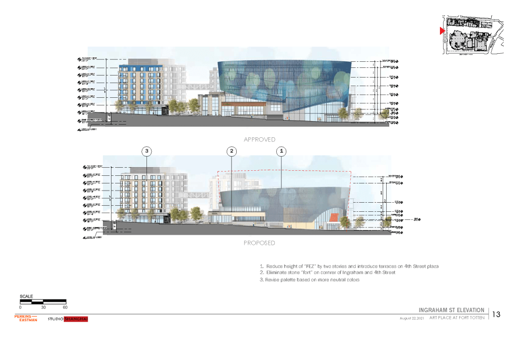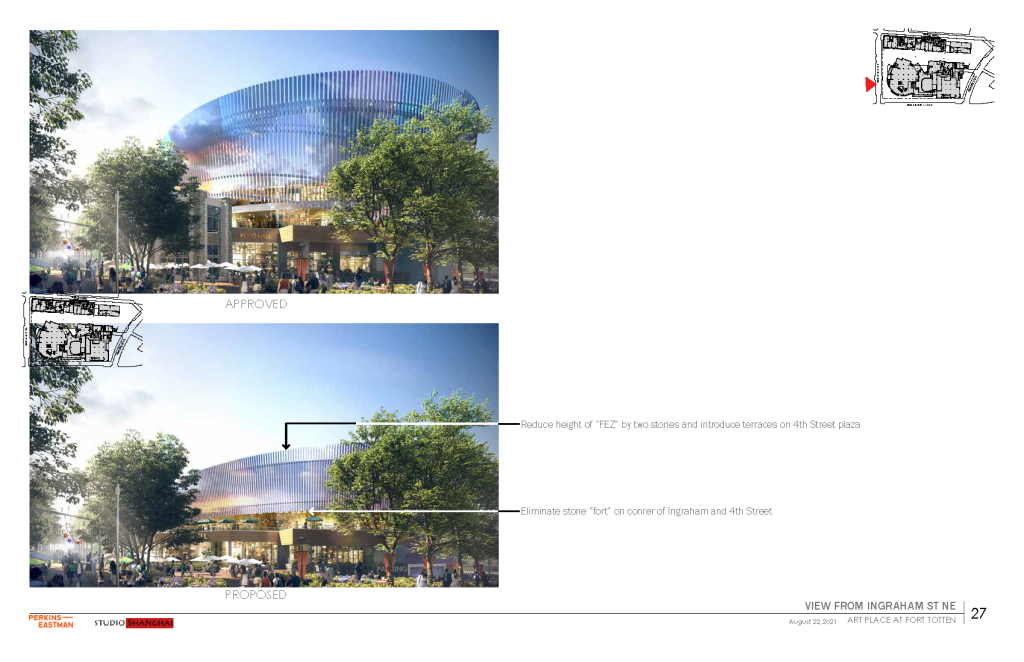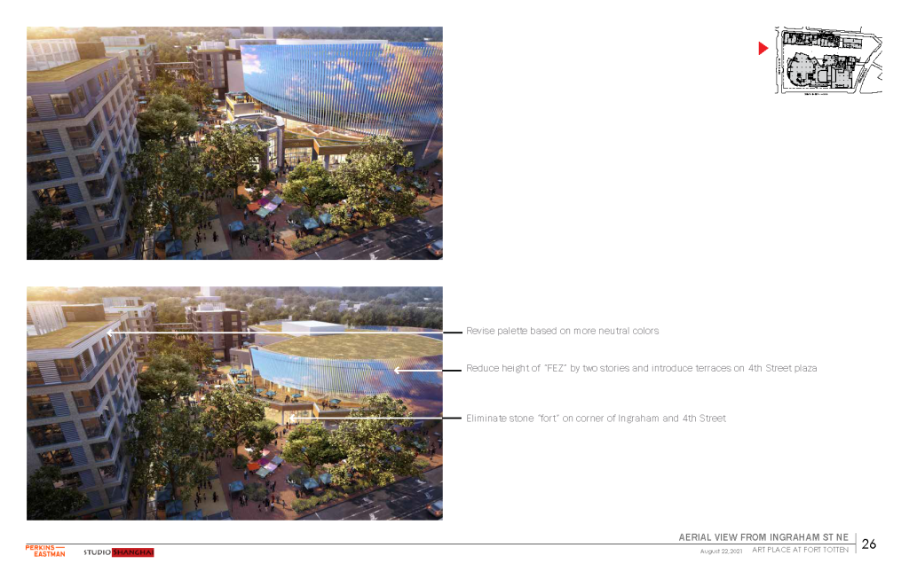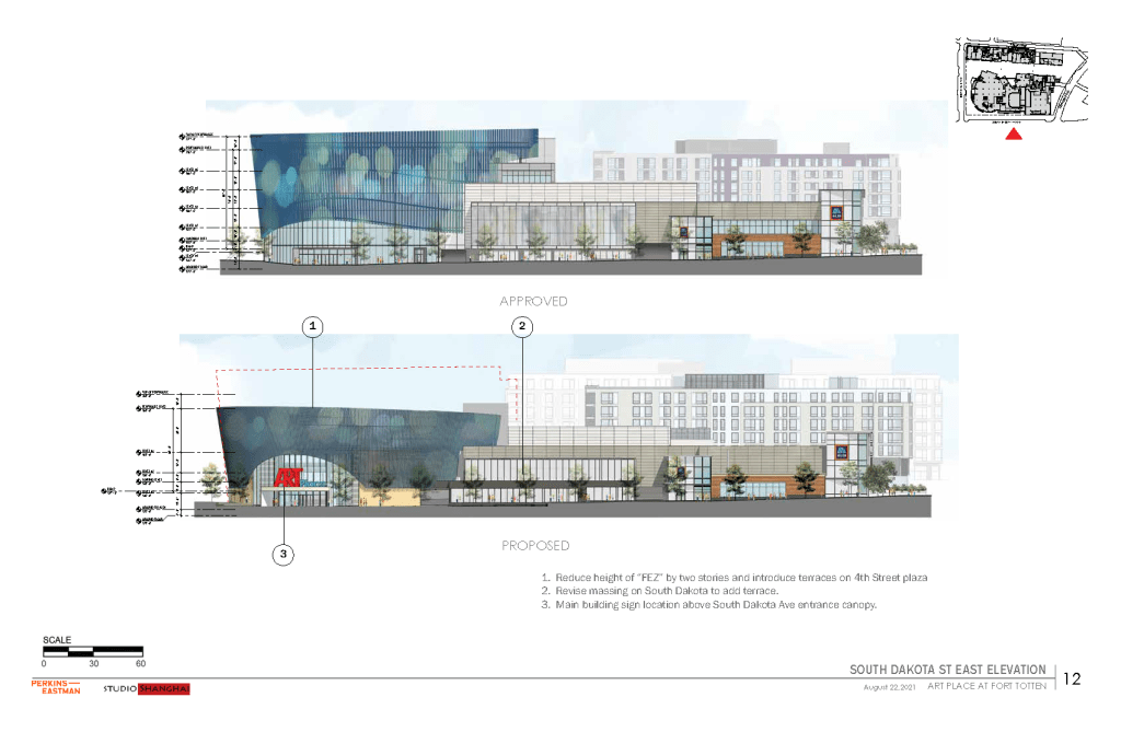 As expected, the Cafritz Foundation has submitted a second application for a modification of consequence for the second phase of Art Place at Fort Totten (also known as “Block B” or “The FEZ at Art Place“) with the DC Zoning Commission (zoning case number 06-10F). After a multi-year journey that is too much to capture in this post, the Zoning Commission approved the second phase of this planned unit development (PUD) with Meow Wolf, effective March 20, 2020 (see these posts for that discussion). On April 21, 2020, the developer filed an application for a modification of consequence with a few changes that was approved by the Zoning Commission, effective September 4, 2020. Now that Meow Wolf is no longer part of the second phase, the developer is back with another application for a modification of consequence due to the change in tenant mix.