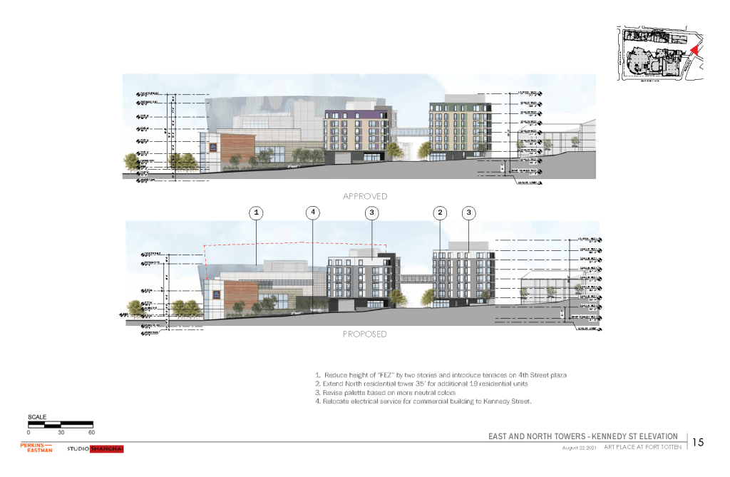 - Extend north residential tower & eliminate amenity terrace to add residential units all the way to Kennedy Street (Note: all of the additional units would be market-rate)