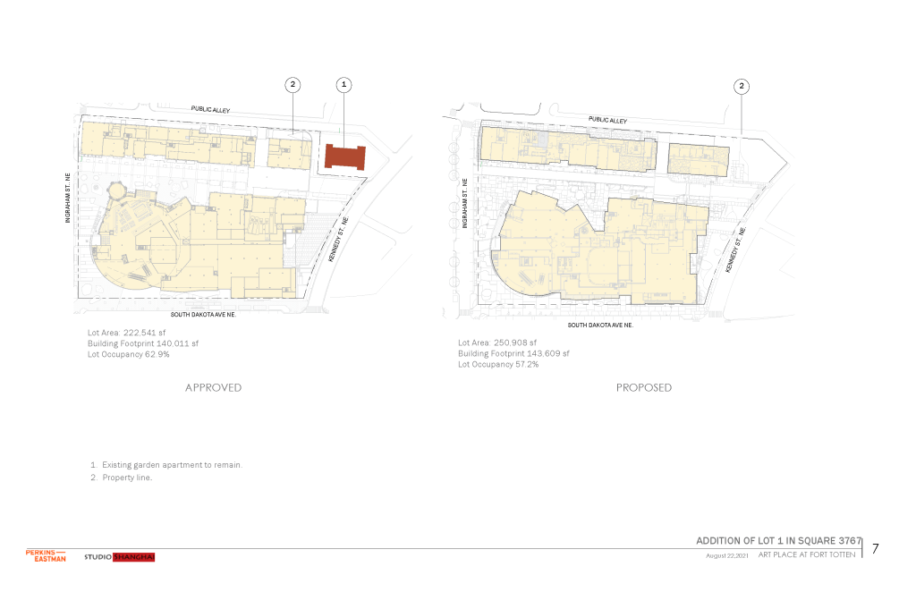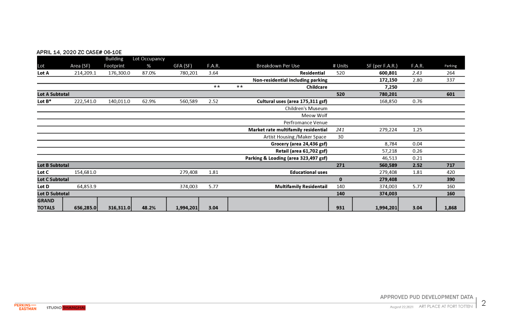 As a result of the unprecedented impacts of the COVID pandemic, Meow Wolf determined that it was no longer able to move forward with the ratified lease for space at the Art Place at Fort Totten Phase B. While no longer pursuing the original plans, Meow Wolf and the Applicant remain excited about the vibrant creative community of Washington DC and the vision for the Arts Place at Fort Totten. Both parties agreed to keep open the option to work together in the coming years in order to find ways to honor each other’s social impact mission for the benefit of the metropolitan area.