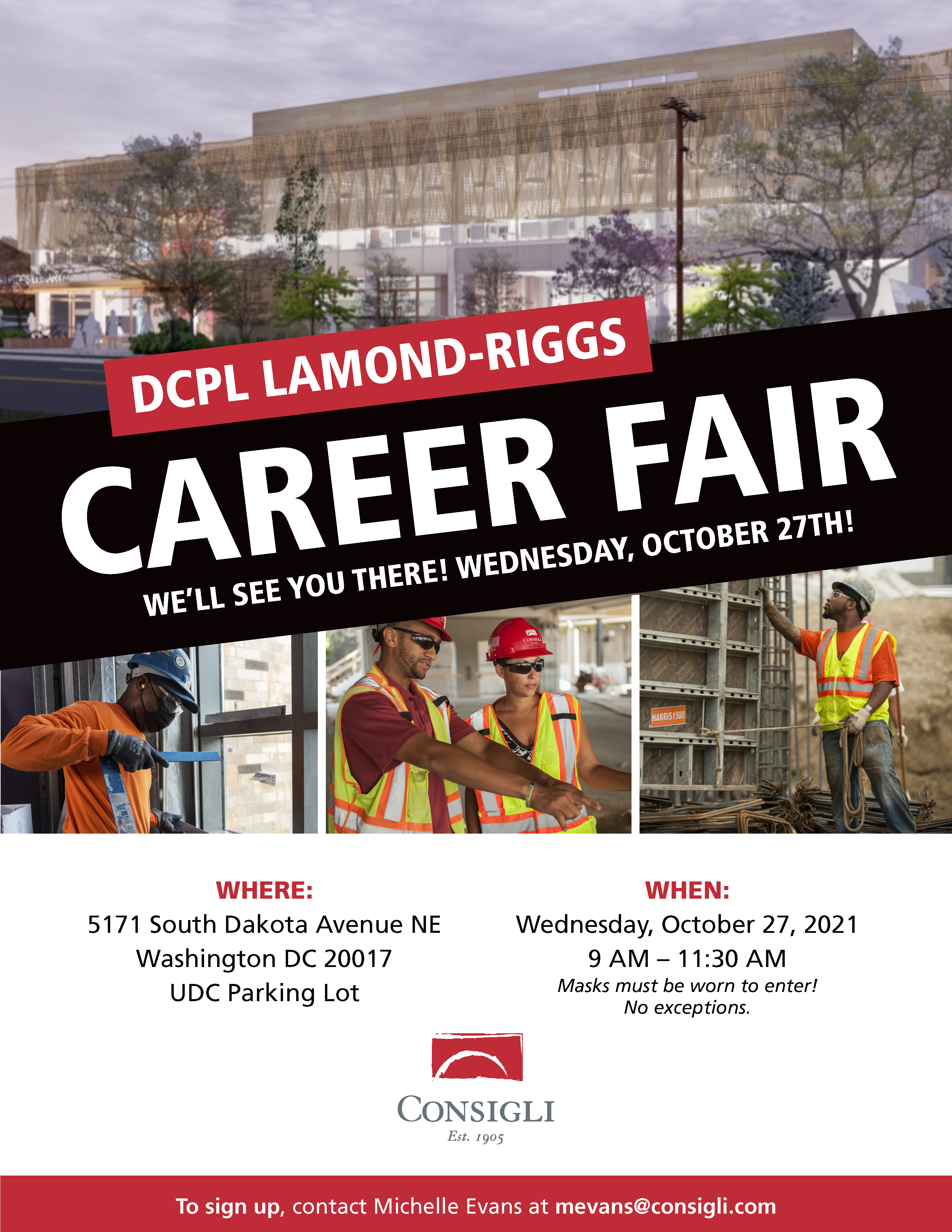Consigli, the construction team building the Lamond-Riggs Library, will be holding a career fair on October 27, 2021. To sign up, contact Michelle Evans at mevans@consigli.com.