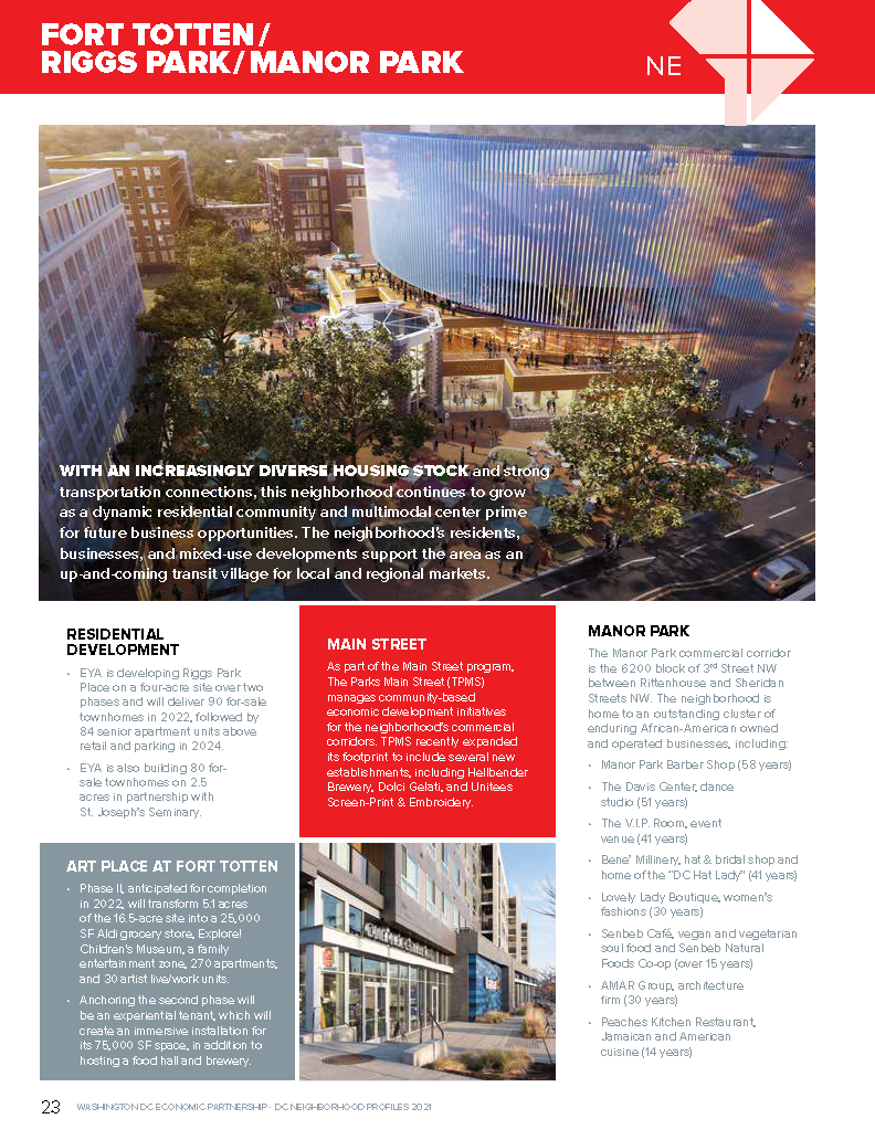The Washington, DC Economic Partnership (WDCEP) recently released its 2021 Neighborhood Profiles. Find the profile sheet for Riggs Park here. Forthcoming projects Riggs Park Place and Art Place at Fort Totten Phase II are once again highlighted in the profile.