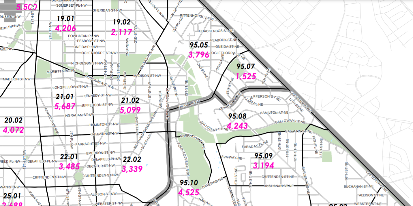 One Ward 5 resident, Geoffrey Hatchard, who CM Silverman noted is a cartographer and geographer, advocated shifting the Ward 5 boundaries. He submitted a map recommendation that adjusted the southern part of the ward (moving part of Ward 6 to Ward 5). His recommendation also included moving the northern border of Ward 5 east of South Dakota Avenue NE from Kennedy Street NE to Hamilton Street NE (moving part of Ward 5 to Ward 4). This northern boundary recommendation does not make sense to me. It sounded like Mr. Hatchard said the census tract boundary is Hamilton Street NE, but as CM McDuffie noted during the hearing, that is not correct. And according to CM Silverman, census tract boundaries are sacrosanct. There are already census tracts across the city that are split between wards, but the one thing this subcommittee will try really really hard not to do is split census tracts.