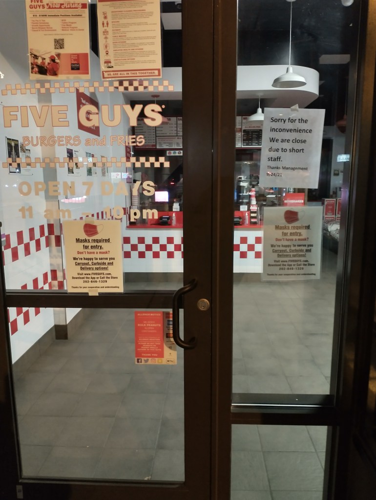 I am behind in posting, will catch up over the next few days. Starting with this picture I took of a sign at the Five Guys at Fort Totten Square around 8:00 pm during Art All Night on September 24, 2021. The sign stated that the restaurant, not scheduled to close until 10:00 pm, was closed due to short staff.