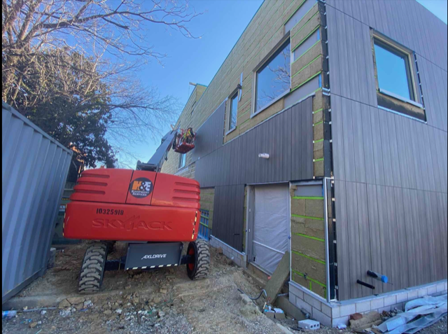 Photo from Kennedy St. site showing cladding (Trespa®) panels installed