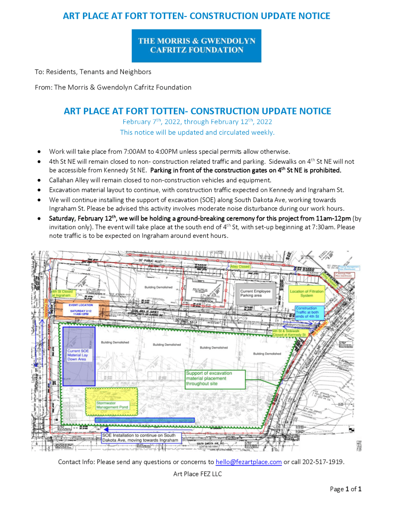 WASHINGTON, D.C. – FEBRUARY 12, 2022 – The Morris and Gwendolyn Cafritz Foundation today celebrated the official groundbreaking for Phase 2 of its two million-square-foot mixed-use development, Art Place at Fort Totten. Joined by Mayor Muriel Bowser, D.C. Councilmembers Janeese Lewis George and Kenyan McDuffie and members of the community, the Morris and Gwendolyn Cafritz Foundation shared its vision for the future of Art Place which is estimated to generate over $1.7 billion in economic impact and over 7,000 total jobs across both phases.