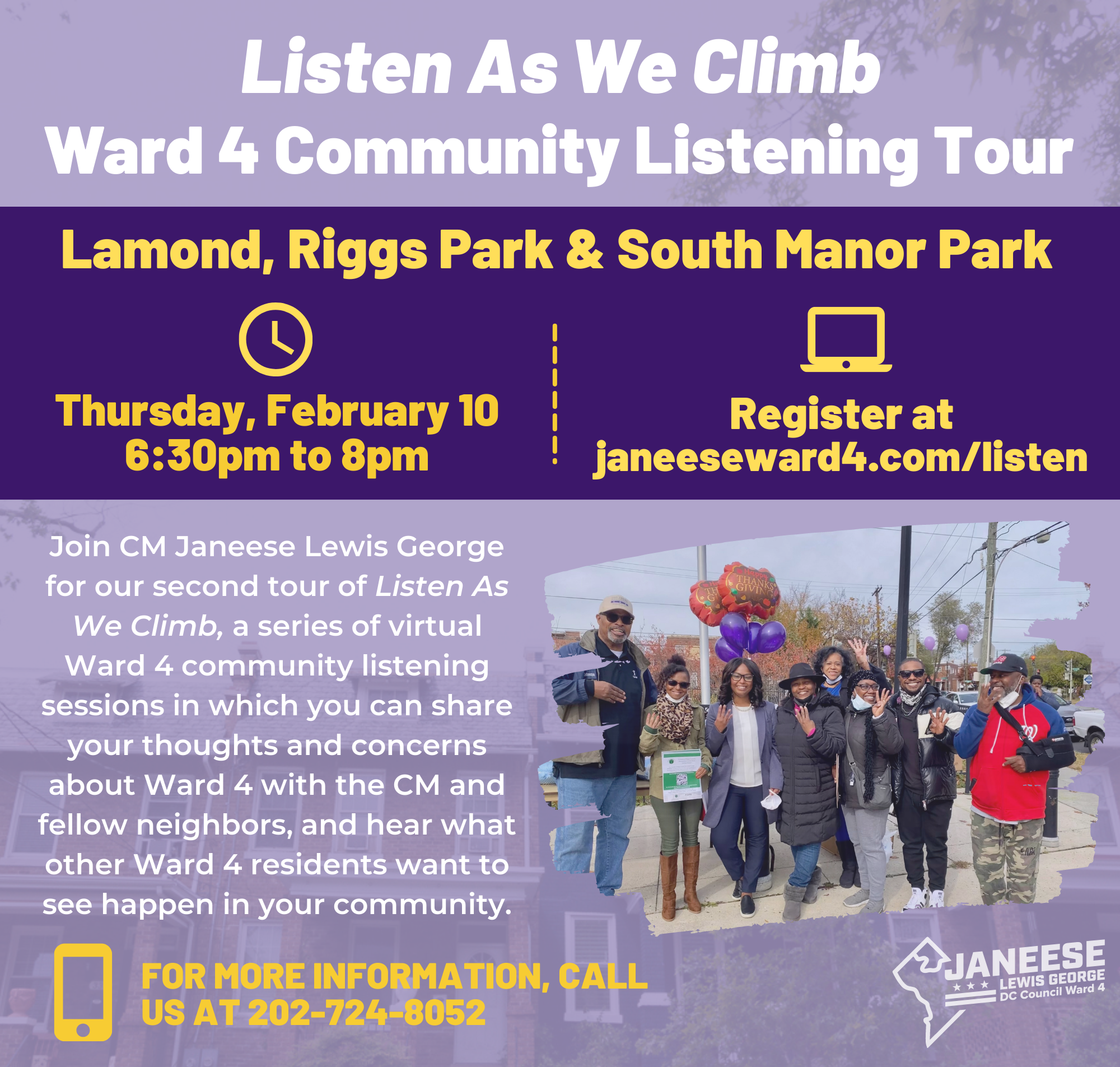 Please join Councilmember Lewis George and your neighbors on Thursday, February 10 at 6:30 pm for your neighborhood’s community listening session over Zoom. Every neighbor will get the chance to discuss the change you want to see in our community and hear from other neighbors too. These events are shaping the work Councilmember Lewis George does when it comes to legislation, the DC budget, constituent services, and efforts in the community.