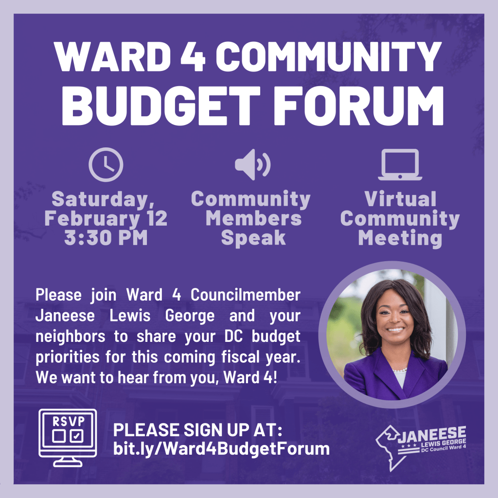 Ward 4 Councilmember Janeese Lewis George is soliciting input on DC’s budget. She will hold a budget forum on February 12, 2022, at 3:30 pm. RSVP at the link.